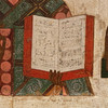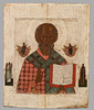 Ikon med malet motiv af St. Nicholas flankeret af helgener på foldet billedflade. Mål 37,7x31,2 cm.