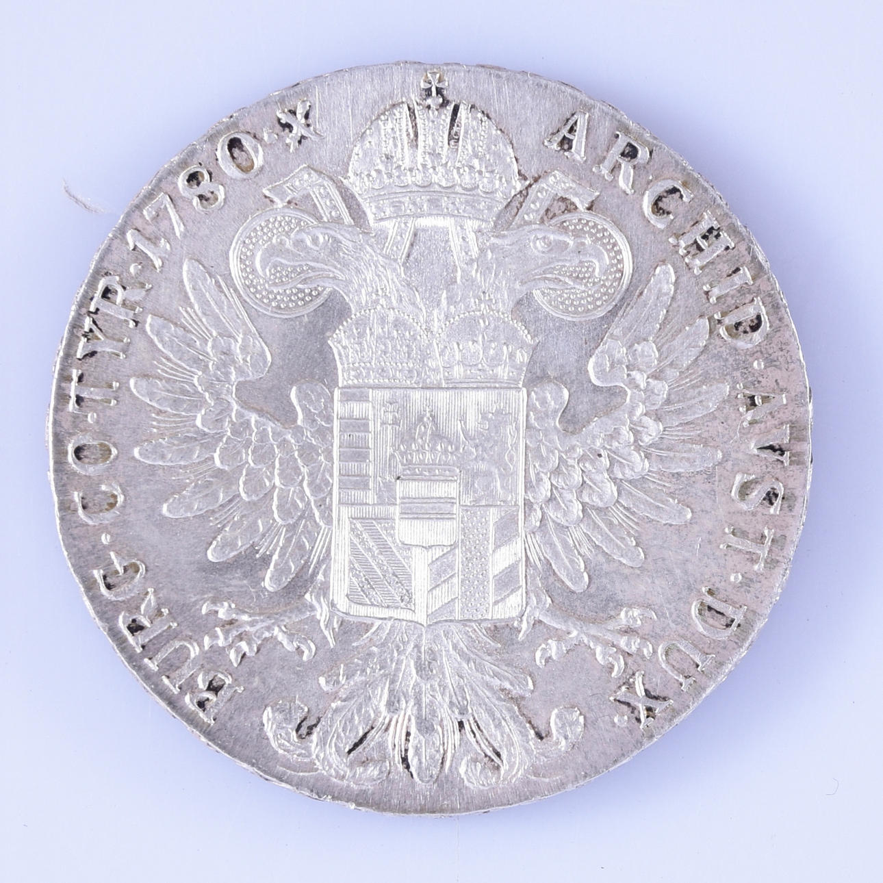 Forside: R IMP HU BO REG M THERESIA ADG SF Bagside: BURG CO TYR 1780 X ARCHID AVST DUX Diameter 40 mm Vægt 28,19 gram.