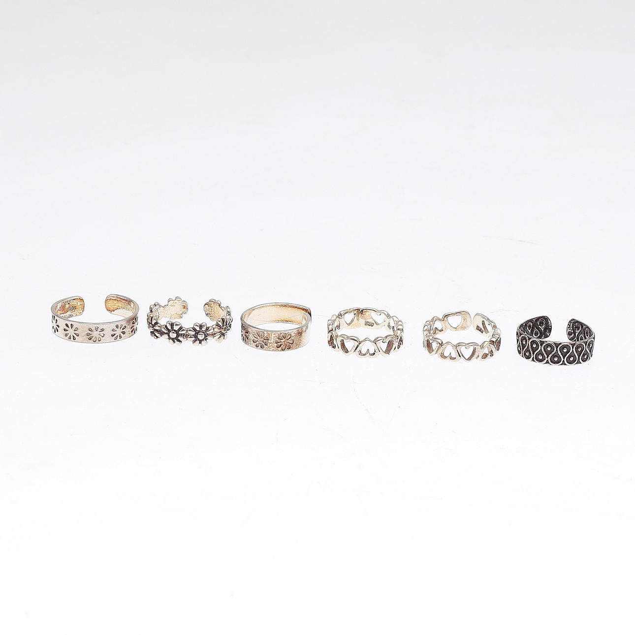 5 ringe indvendig diameter 11,79 - 12,75 mm. 1 ring 15,40 mm. 6 tåringe sterling sølv åben/justerbar størrelse.