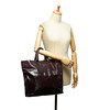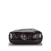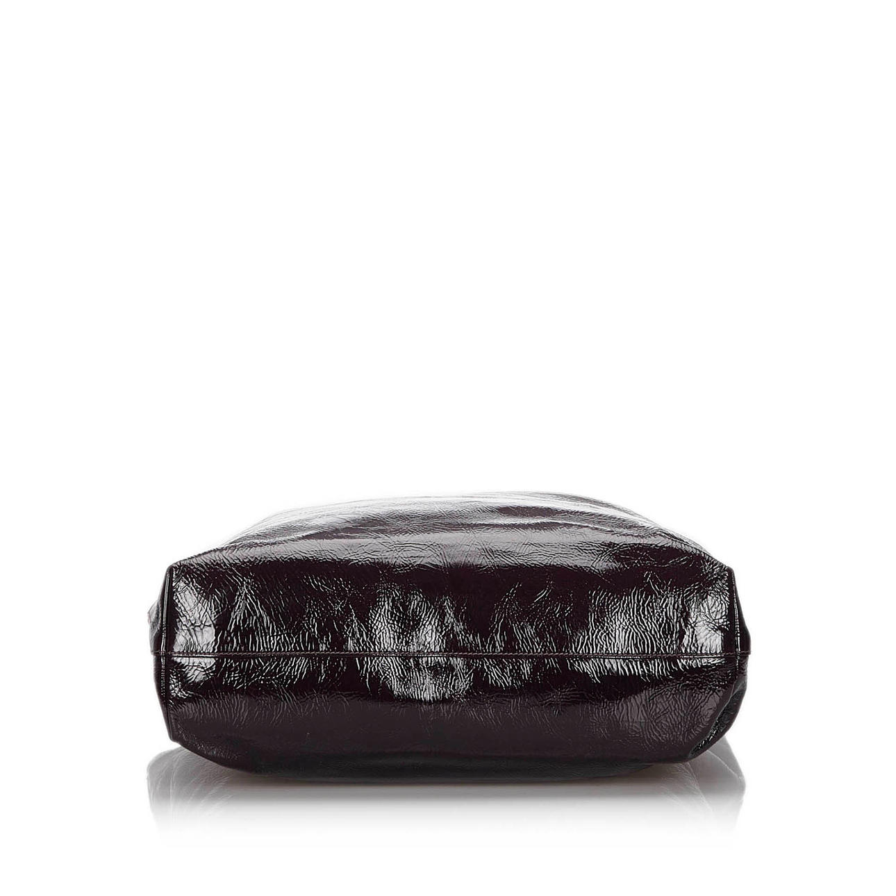 Læder med lak overflade. Indvendige rum, hvoraf det ene har lynlås. Taskens højde eksklusive håndtag ca 35 cm. Bredde ca 35 cm. Dybde ca 11 cm. Dustbag og kort medfølger.