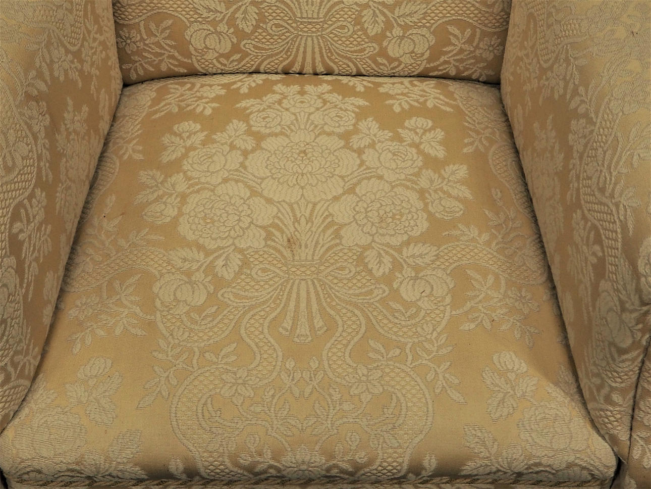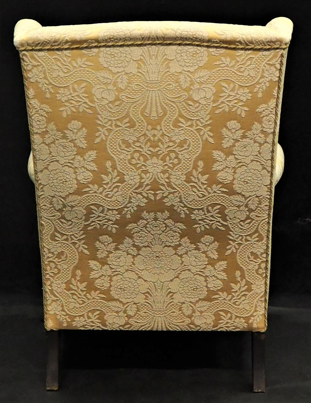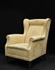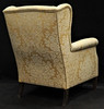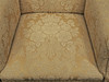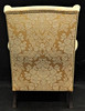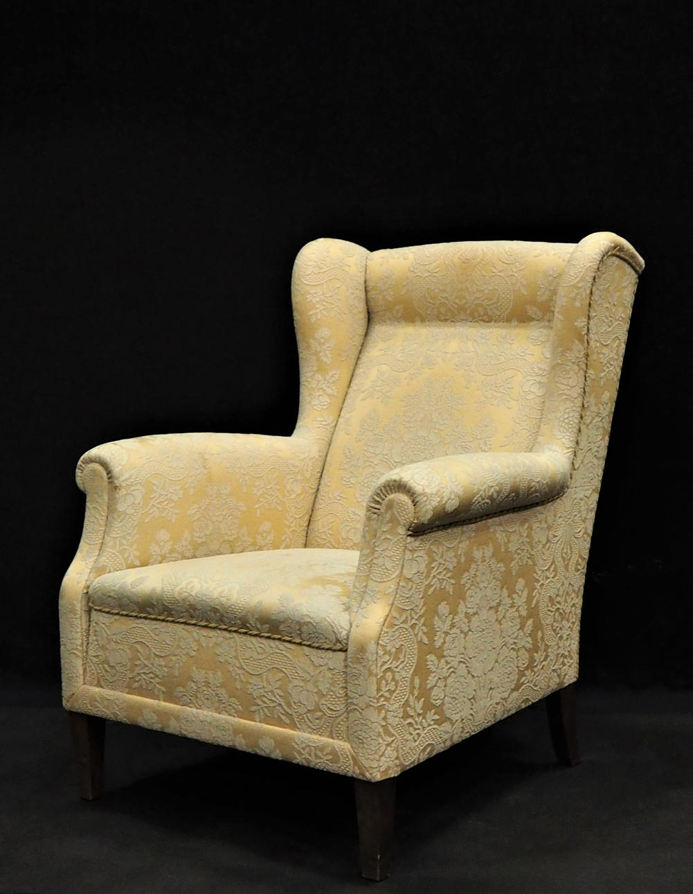 Øreklap model. Klædt i stof, guldbrokade. Ryghøjde ca 100 cm, sædehøjde 43 cm, dybde ca 90 cm, bredde ca 80 cm.