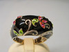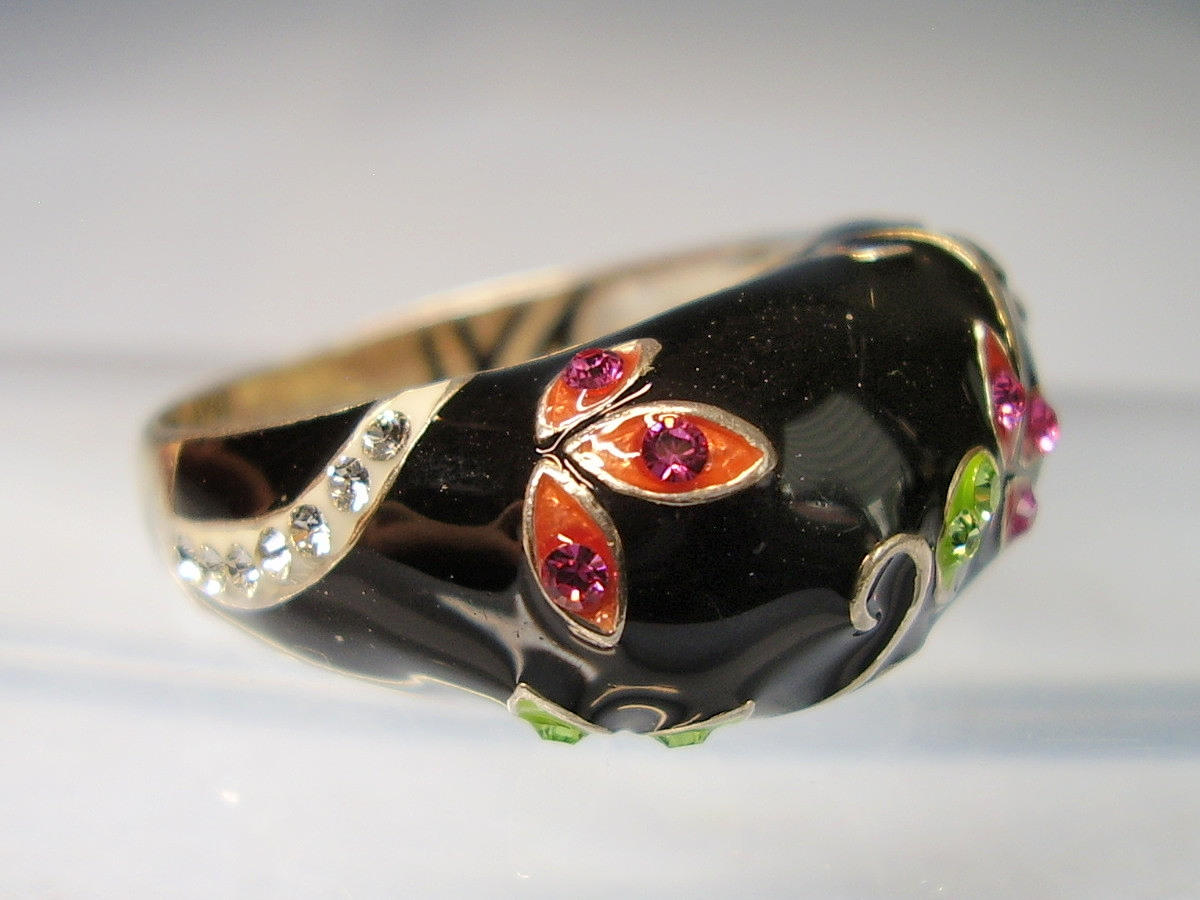 Ringhovedet er emaljeret i sort emalje op til ringskuldrene og bærer sølvranker med blomster og løv. Blomsterne er sat med forskellige farvede sten. Ringskinnen efterlades i sølv.