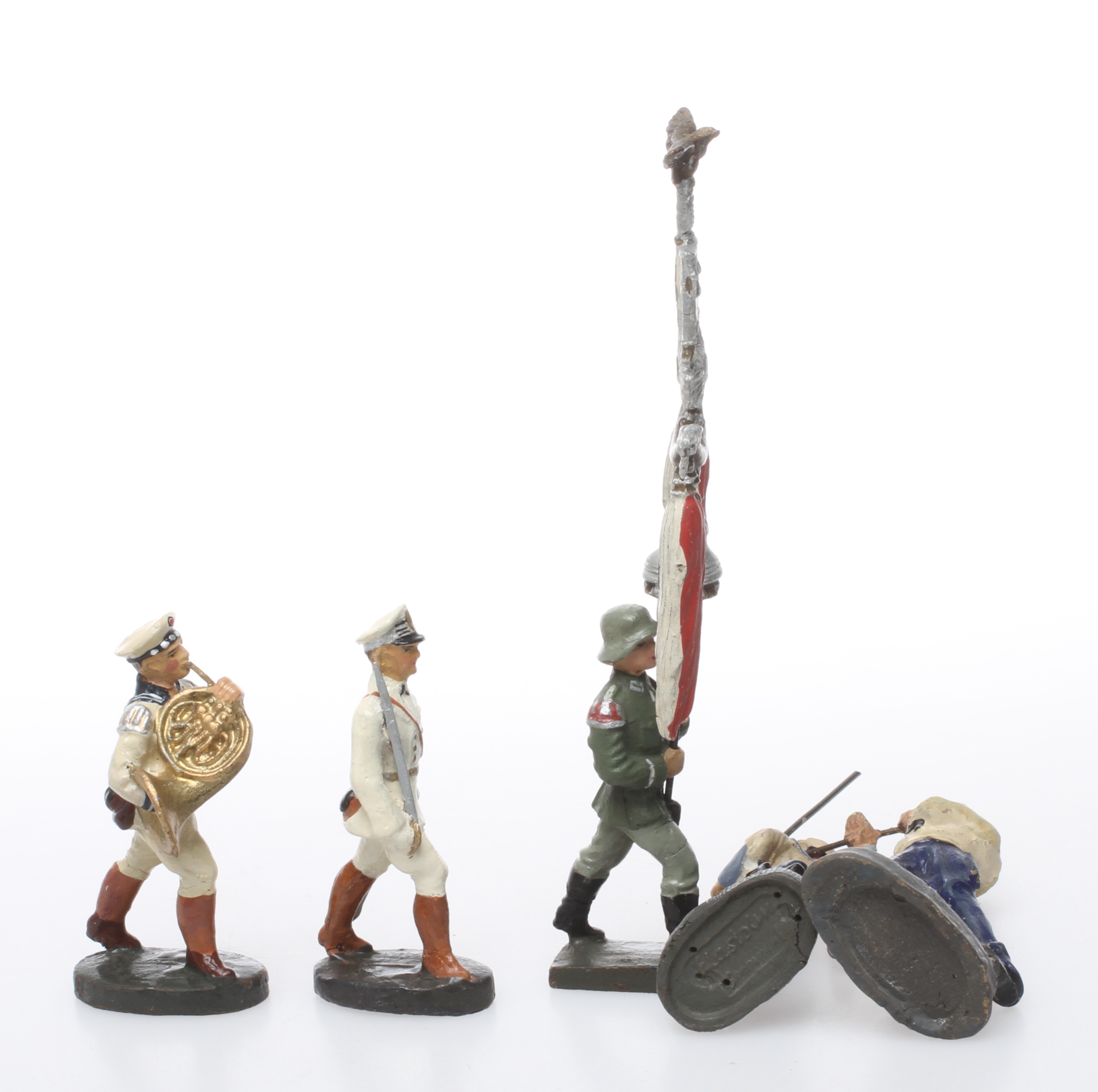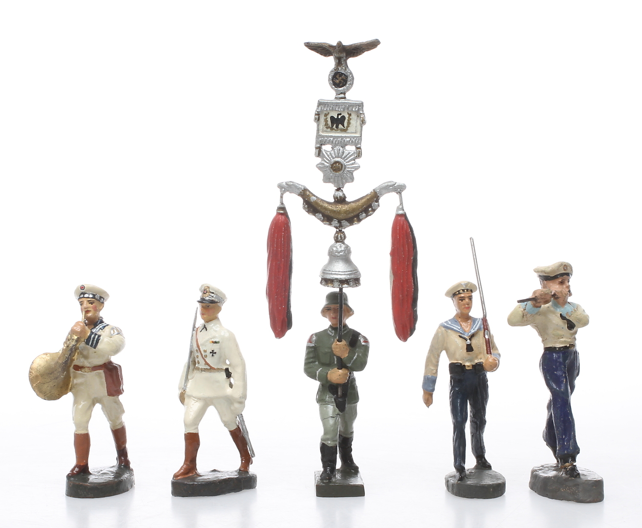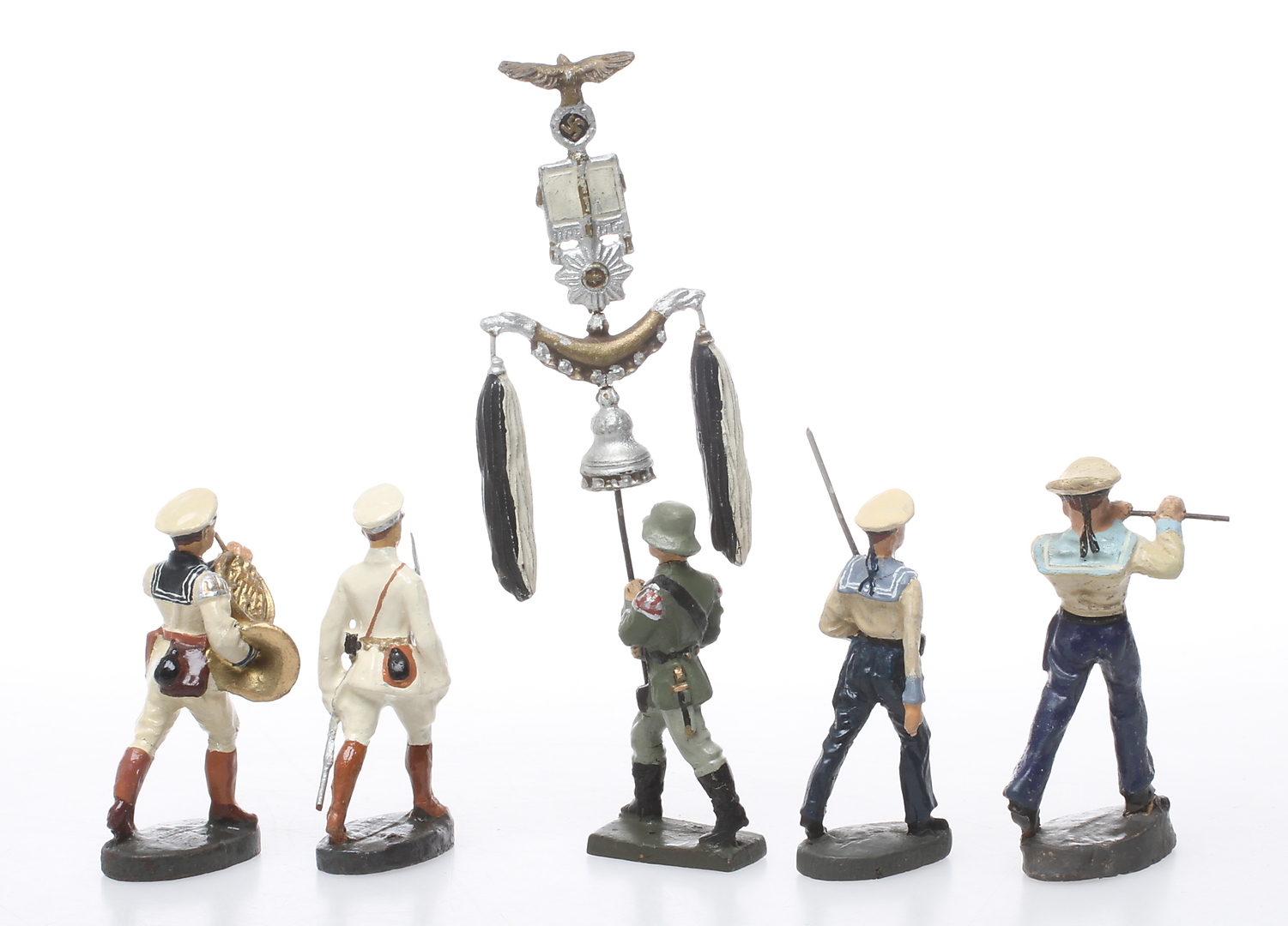 132582. ELASTOLIN LINEOL FIGURES, 4 KRIEGSMARINE og en Schellenbaum-bærer.