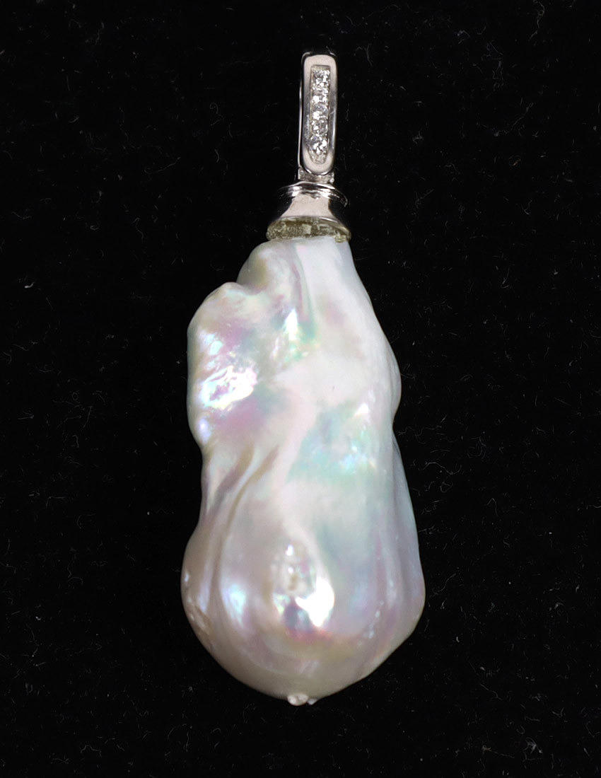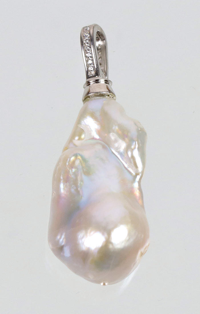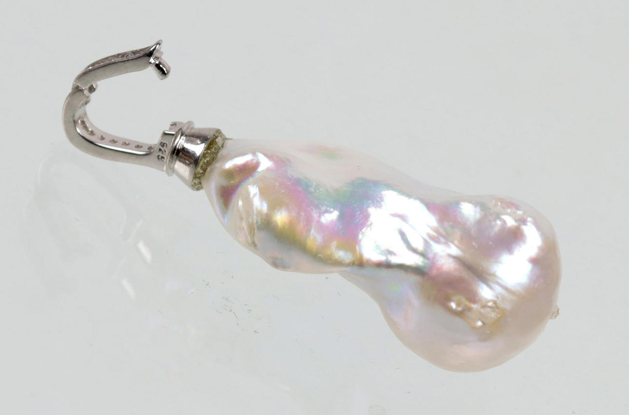 Drageperle med naturligt dyrket charme, med clipsvedhæng i 925 sølv, længde 48 mm, bredde ca. 17 mm, vægt 10 gram.