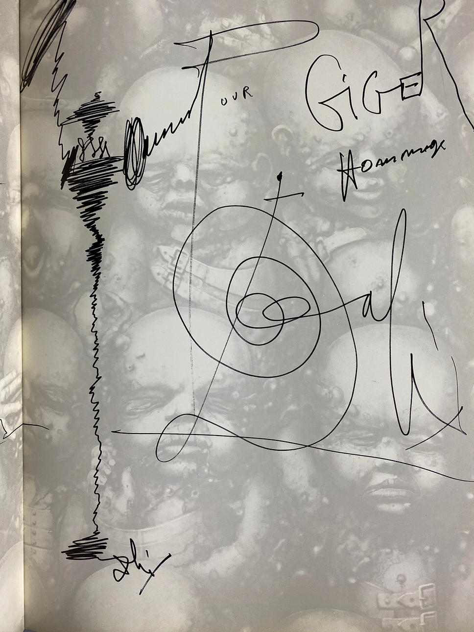HR Giger (Hansruedi Giger) (Chur 1940 - 2014 Zürich) - "Necronomicon", Sphinx-Verlag, Basel 1978, 2. Udgave, 78 sider med talrige illustrationer, nogle i farver, flueblad med trykt dedikation af Salvador Dali, ca 42x29,5cm.