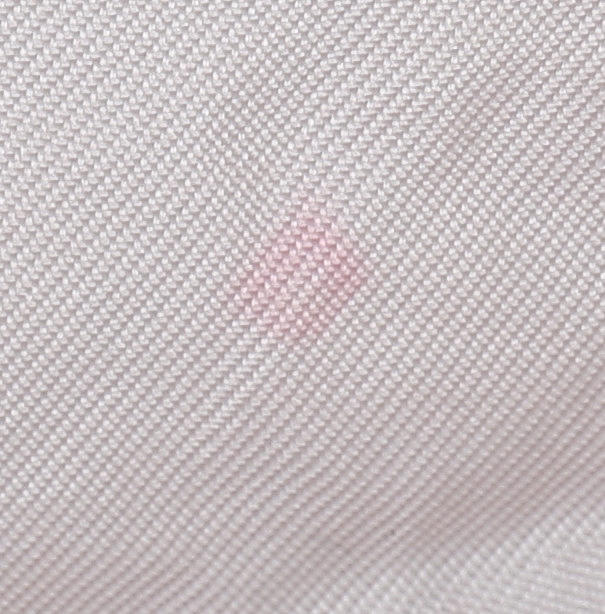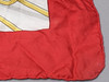 Rød kant, hvid baggrund og polykromt mønster.
