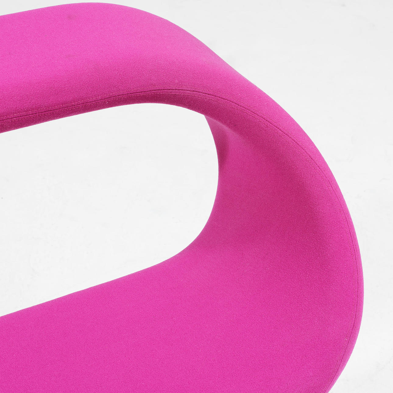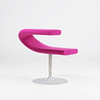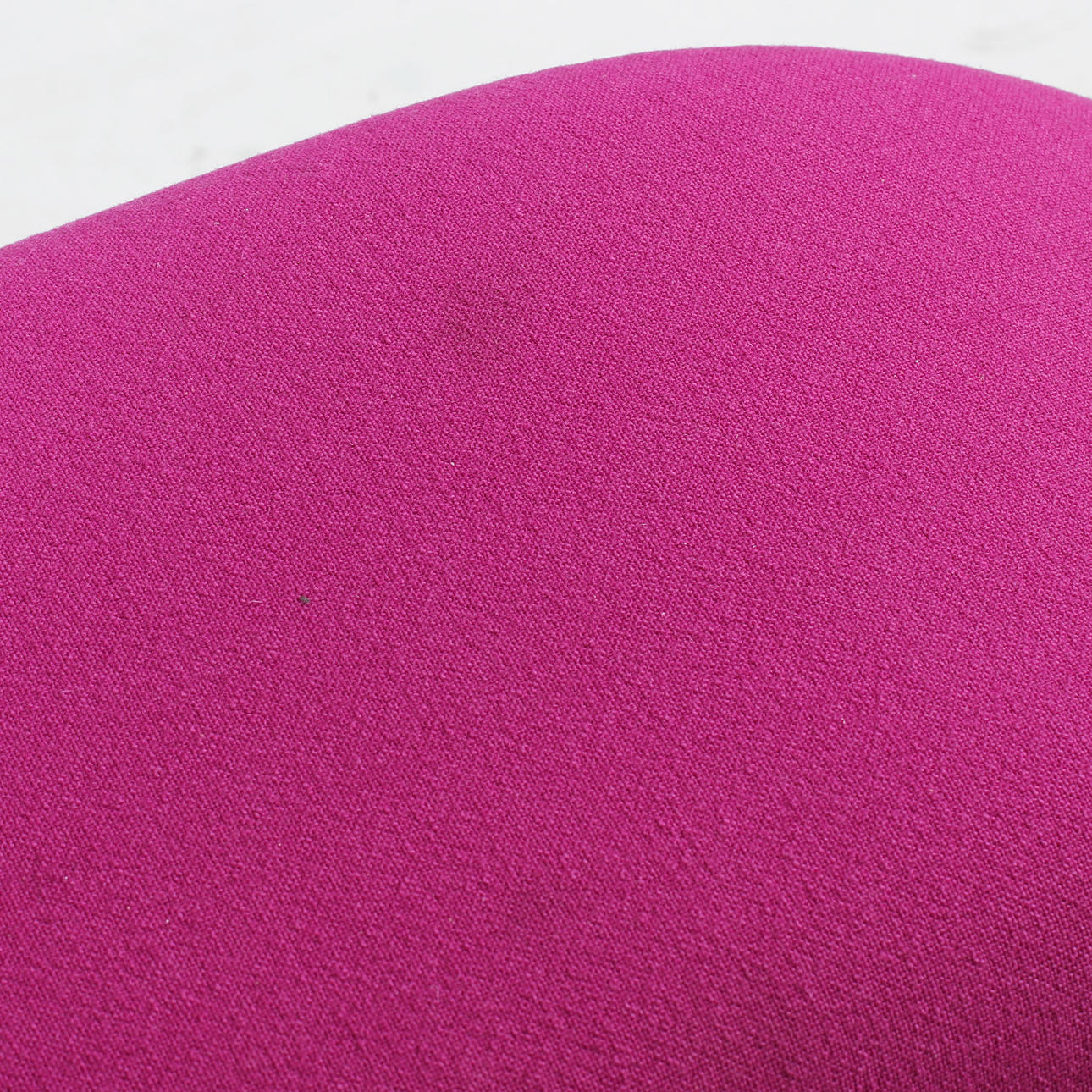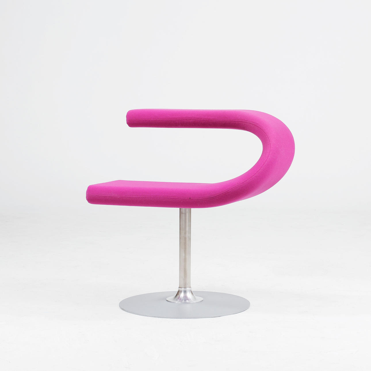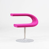Buet form på drejelig metalbund. Fast polstret ryg og sæde betrukket med rosa-lilla stof. Mærket.