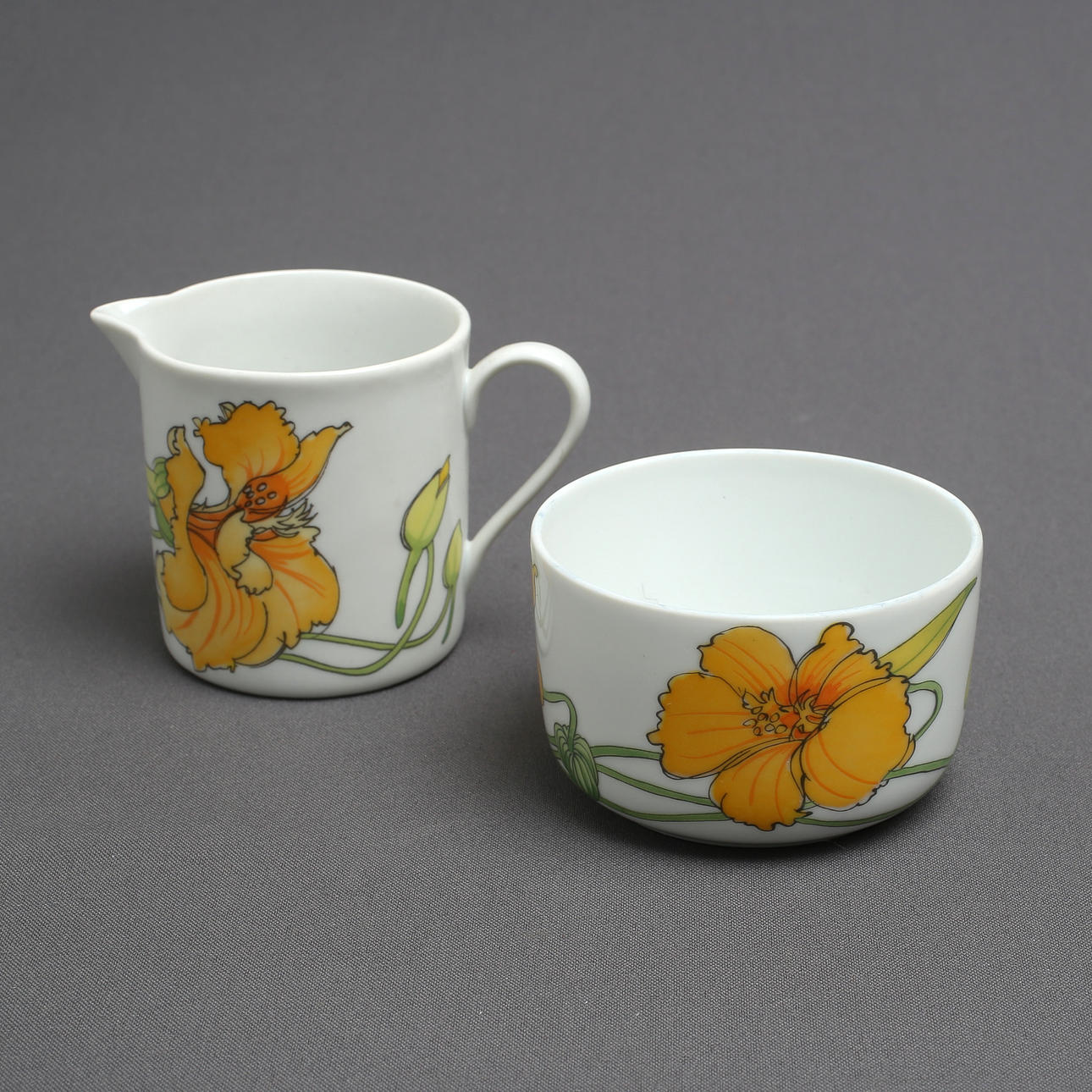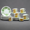 Bestående af: 7 kopper med underkopper, 8 tallerkner, flødekande, sukkerskål.