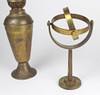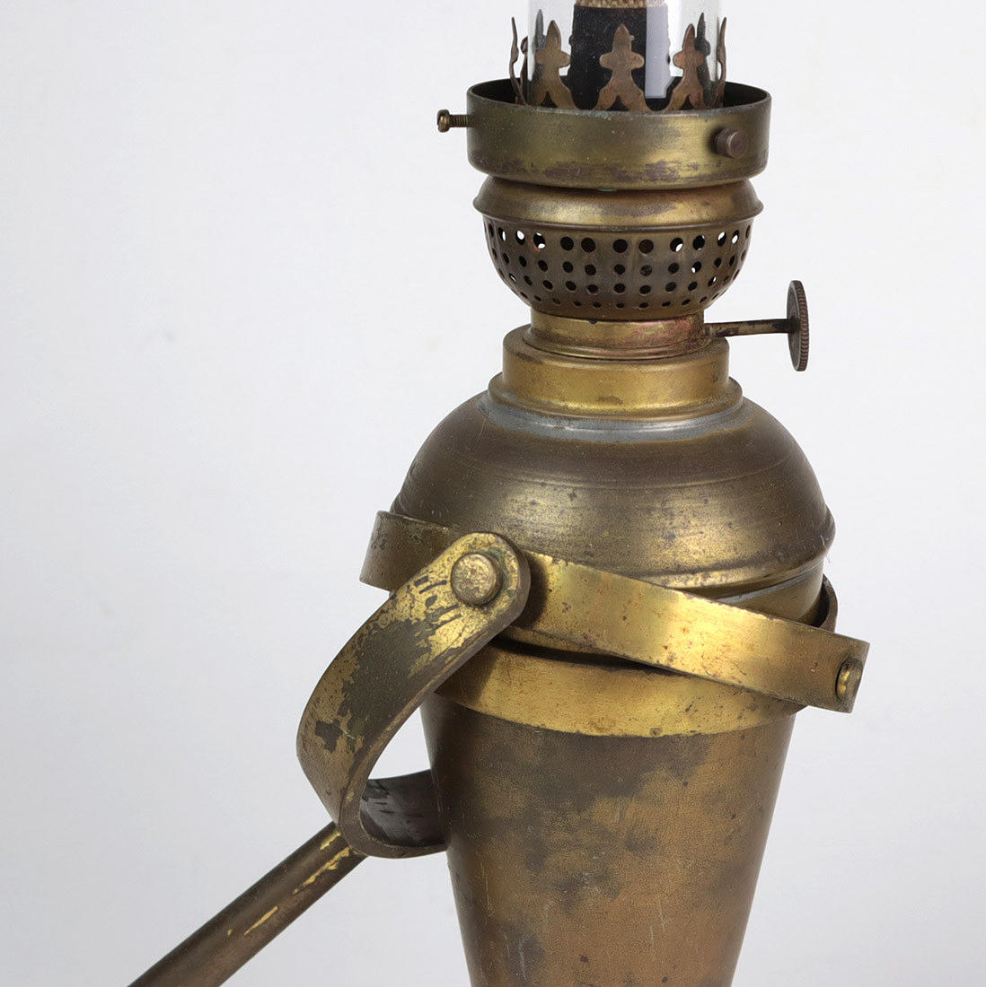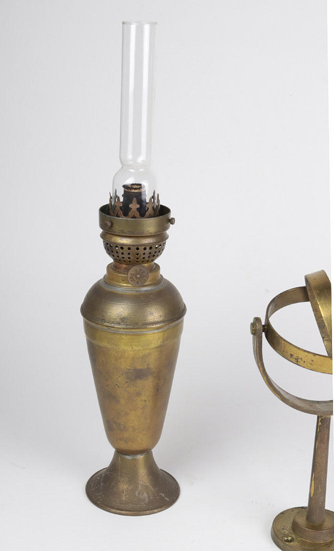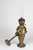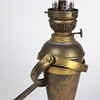 messing, konisk hoved tilspidset nedad på tragtfod, med brænder og glaskolbe, højde ca. 44 cm plus dobbelt bevægeligt vægbeslag (svajkompensation på åbent hav), i alt. 2 dele.