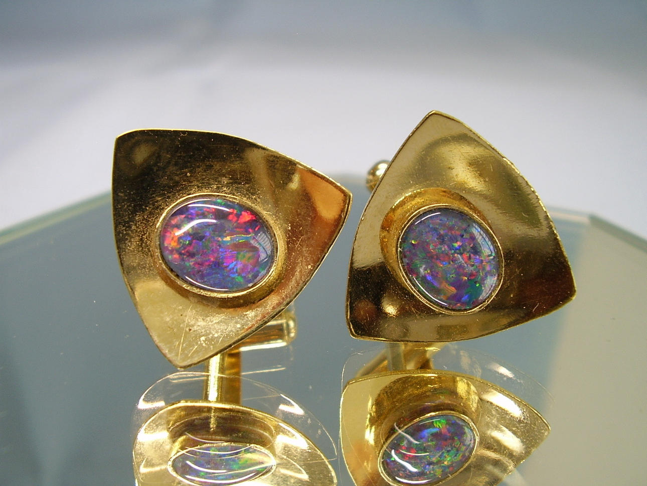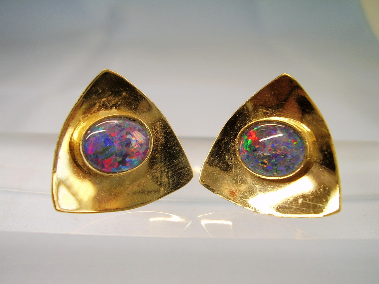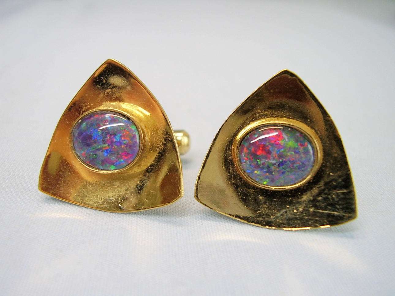 Manchetknapperne er lavet af dobbelt guld. De er prydet med brændende, skinnende opaler i glatte omgivelser i en trefoil grundform og en poleret overflade: Opalerne er iriserende i de eftertragtede farver rød, grøn og blå.