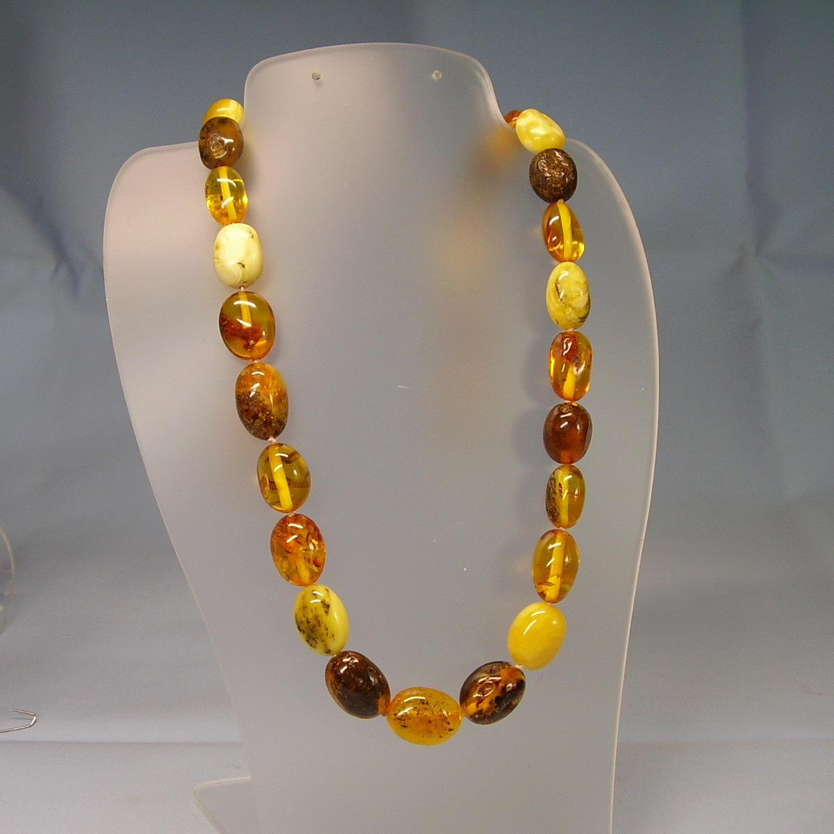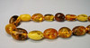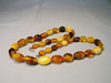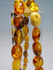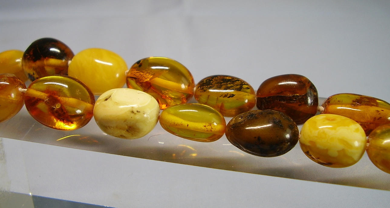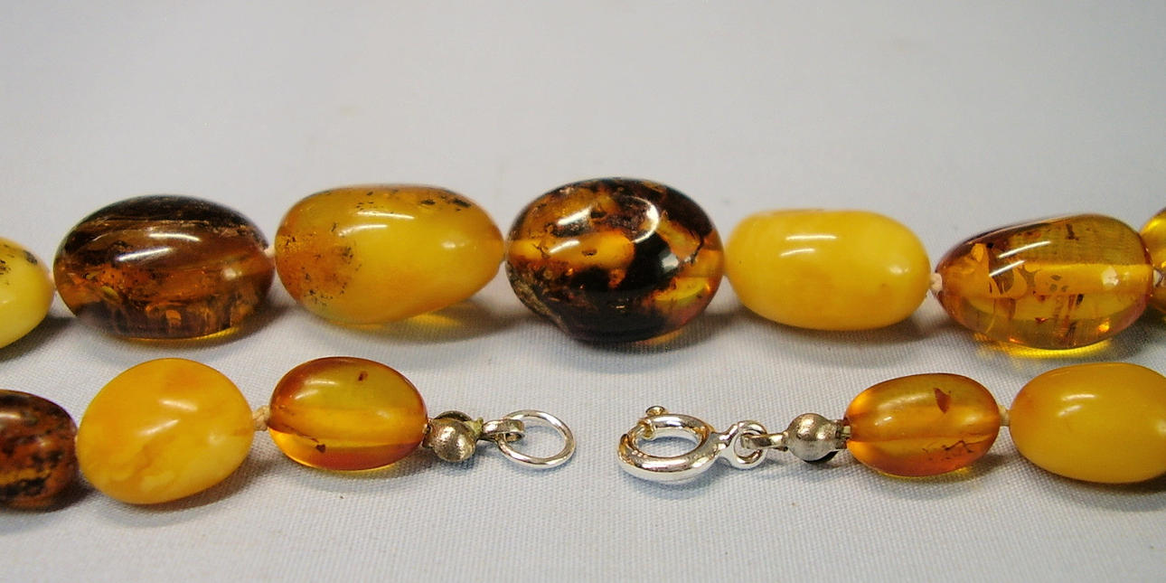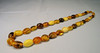 Kædelængde 64 cm, ravfarvede oliven ca. 11,4 x 8 mm stigende til 19,4 x 15,1 mm, vægt 46,2 gram.
