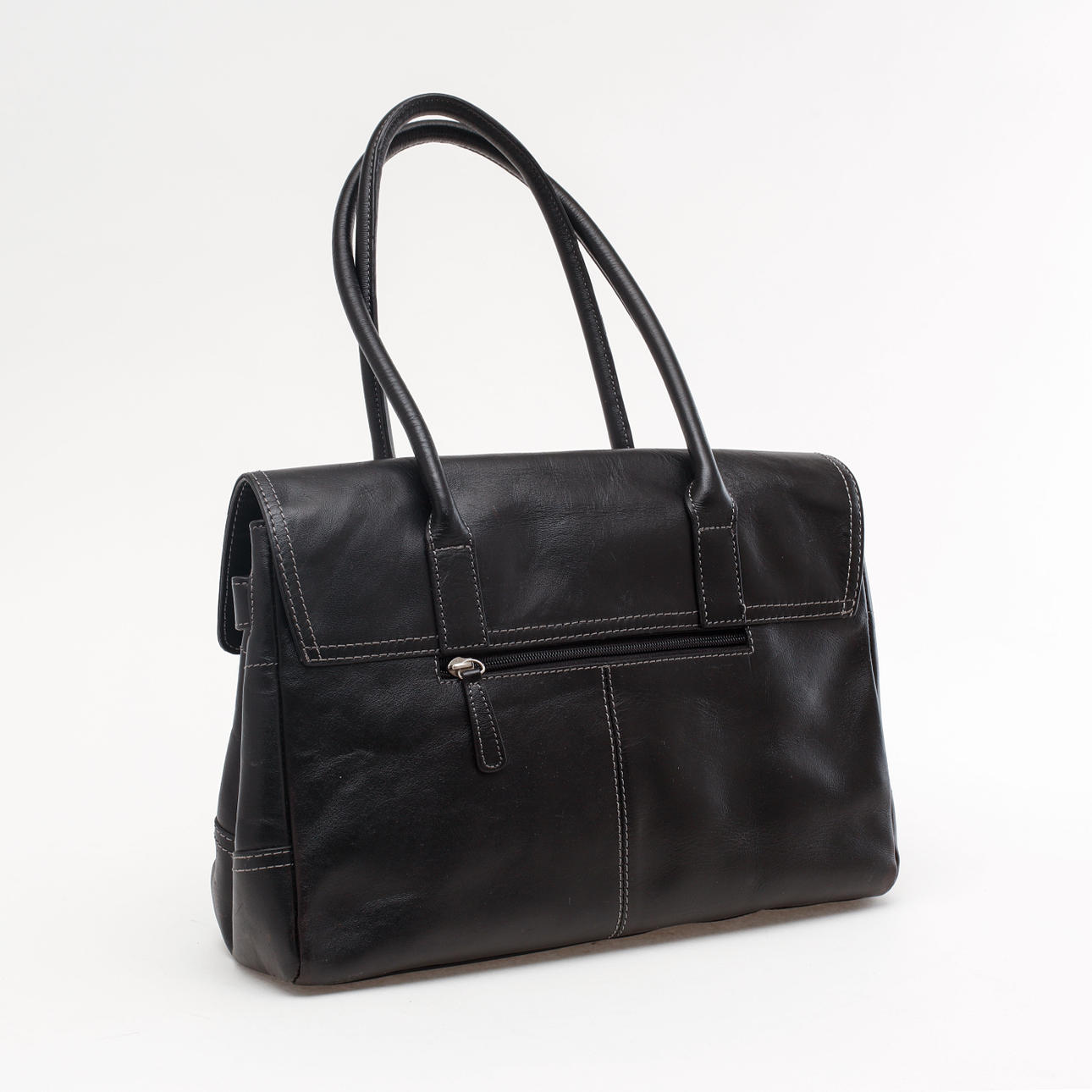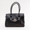 Håndtaske i sort læder med sølvmetaldetaljer. Stofforet. 6 indvendige rum hver med to lynlåse. Et rum på bagsiden af tasken. Mærket "ETIENNE AIGNER EST. 1949". Mål 36x26x9 cm.