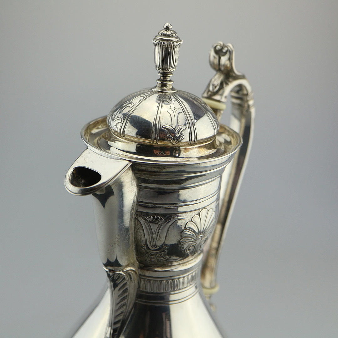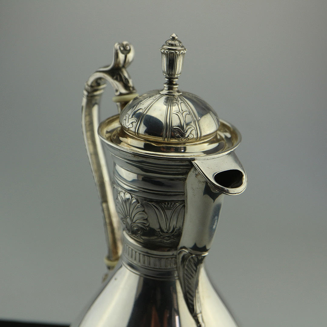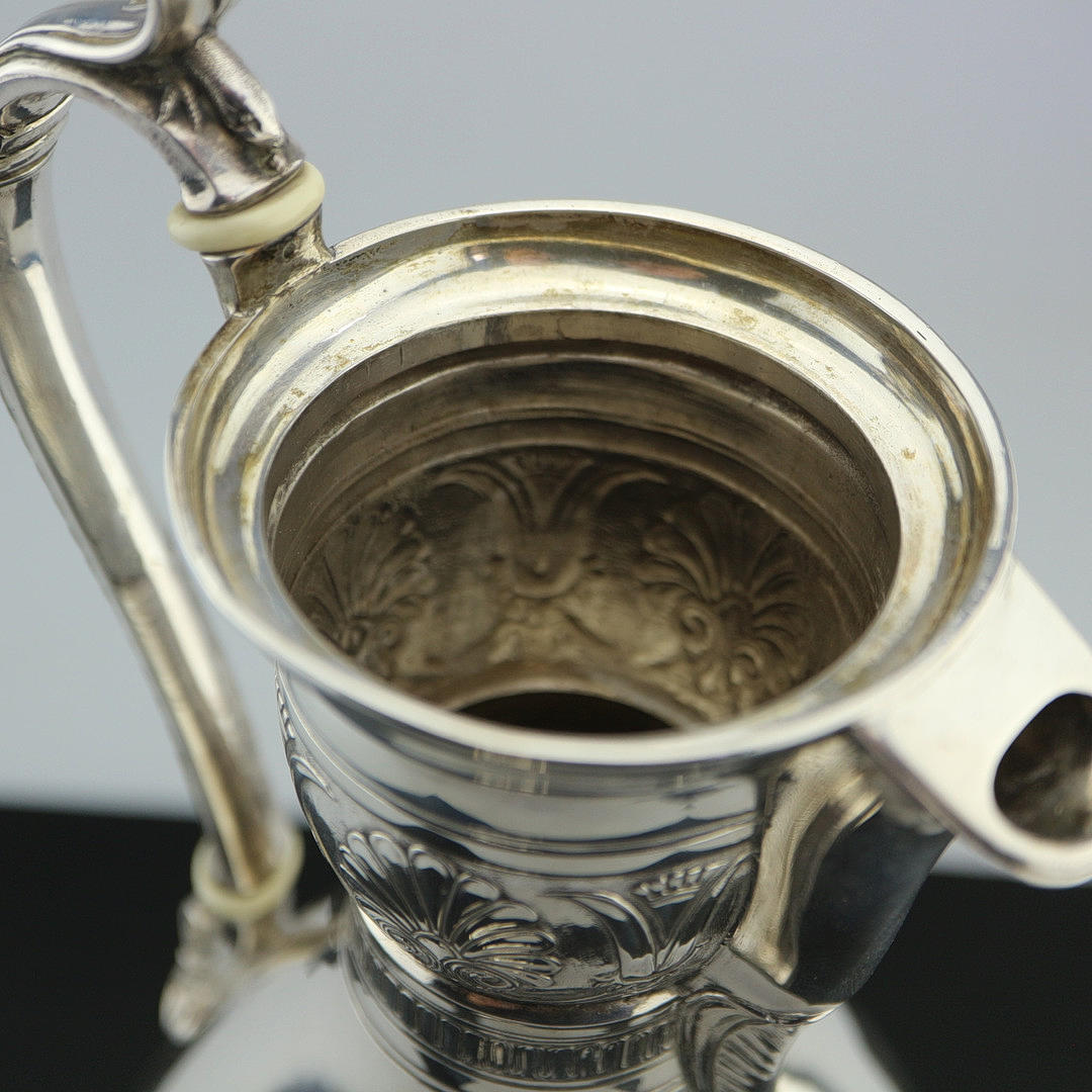 Sølvkande, Danmark, slutningen af 1700-tallet. På halsen med all-round ornament, krop poleret glat. Med elfenbenspåføring på håndtaget, aftageligt låg. Stemplet nedenunder: 3 tårne, mestermærke, kendetegn. Gravering: OMP Højde med låg: 28 cm. Vægt: 504 gr.