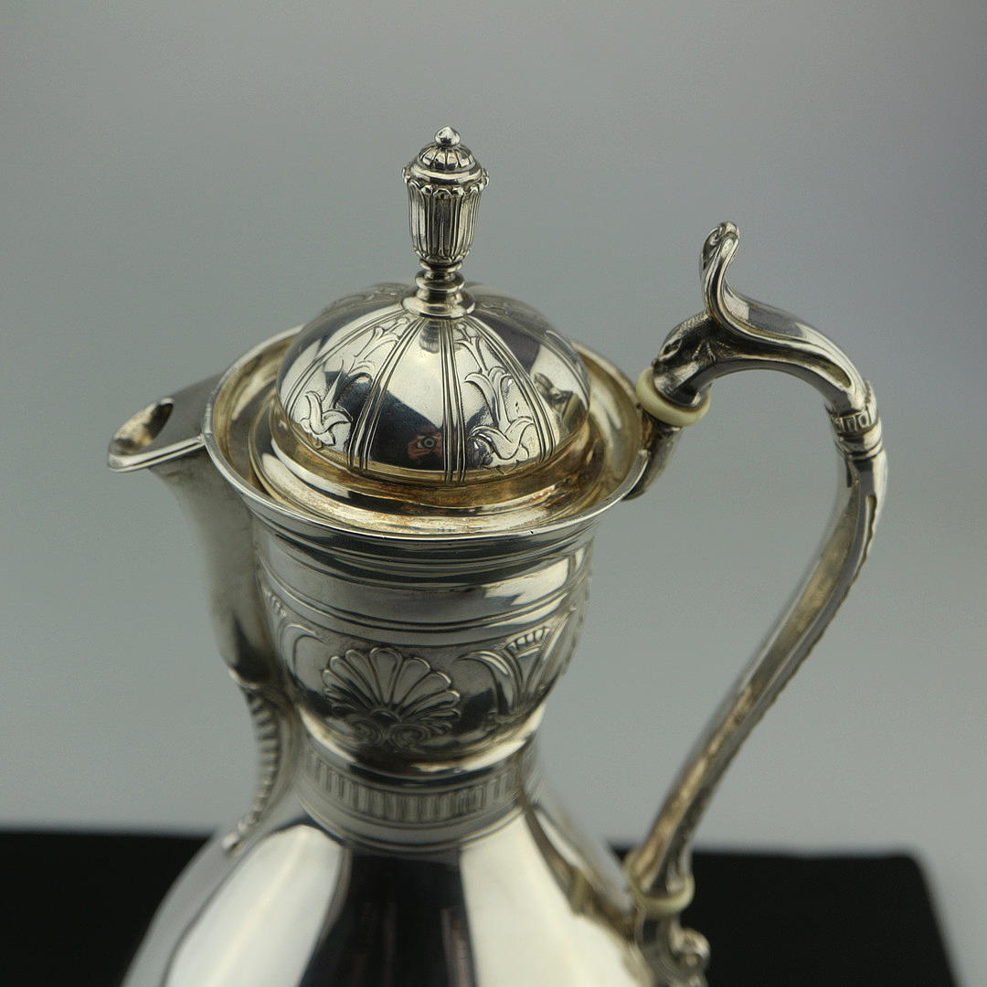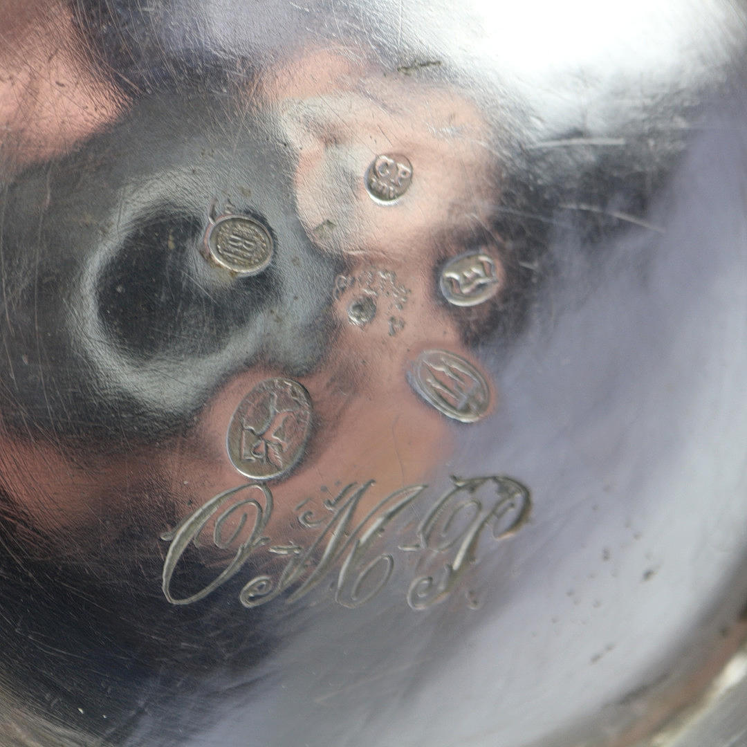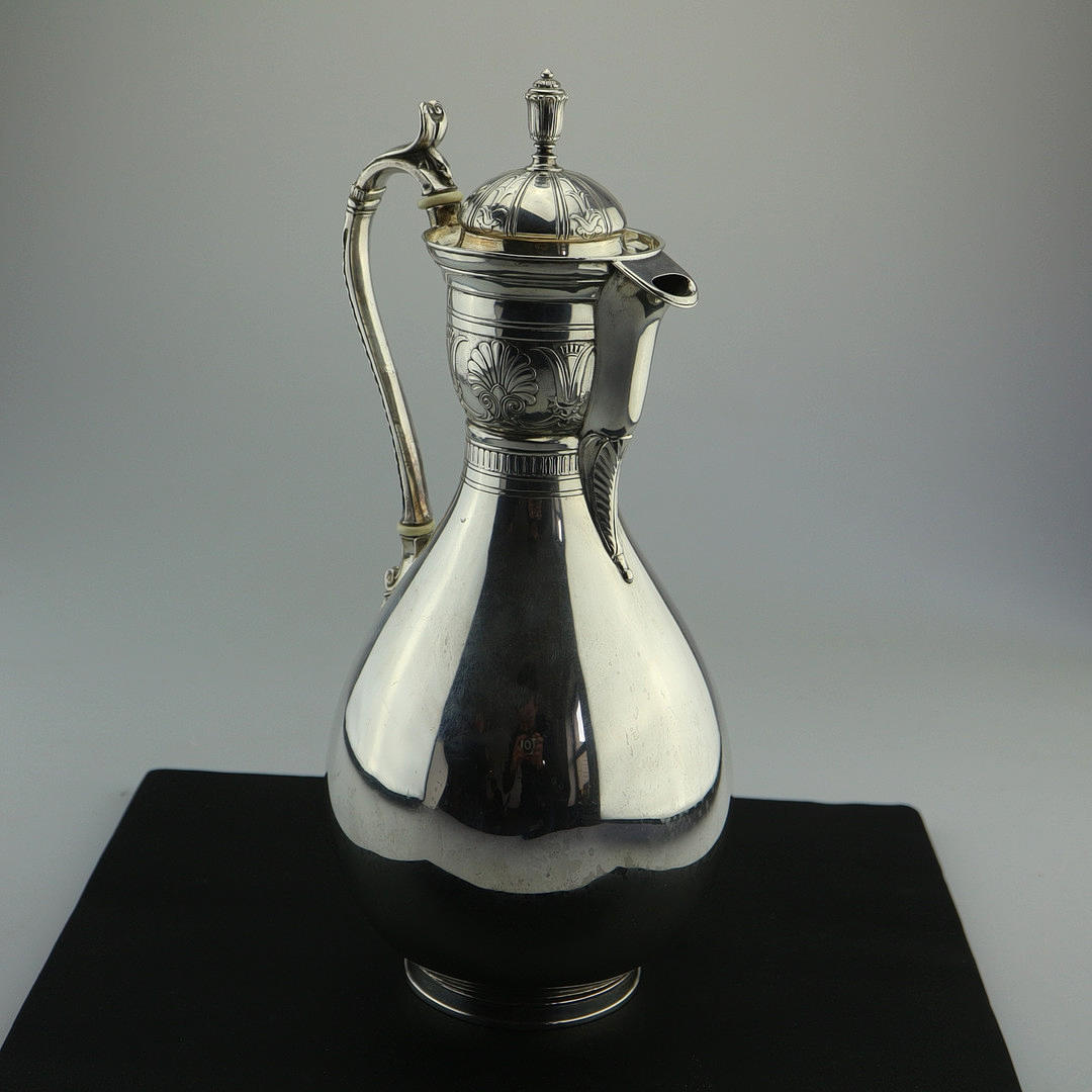Sølvkande, Danmark, slutningen af 1700-tallet. På halsen med all-round ornament, krop poleret glat. Med elfenbenspåføring på håndtaget, aftageligt låg. Stemplet nedenunder: 3 tårne, mestermærke, kendetegn. Gravering: OMP Højde med låg: 28 cm. Vægt: 504 gr.