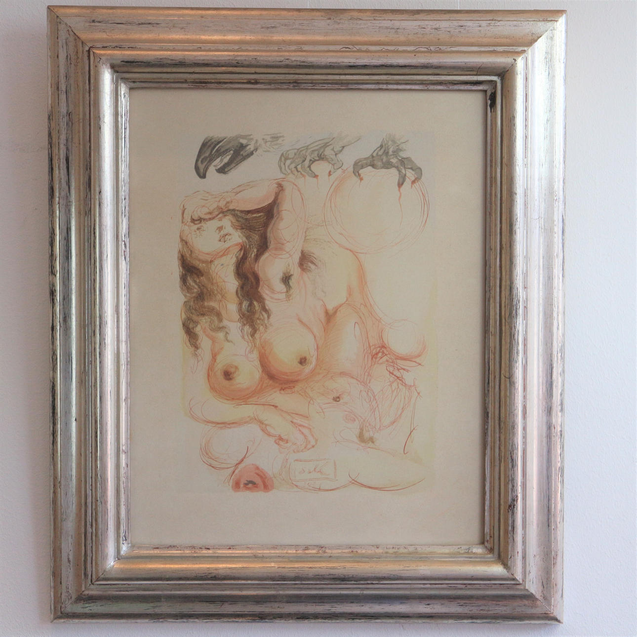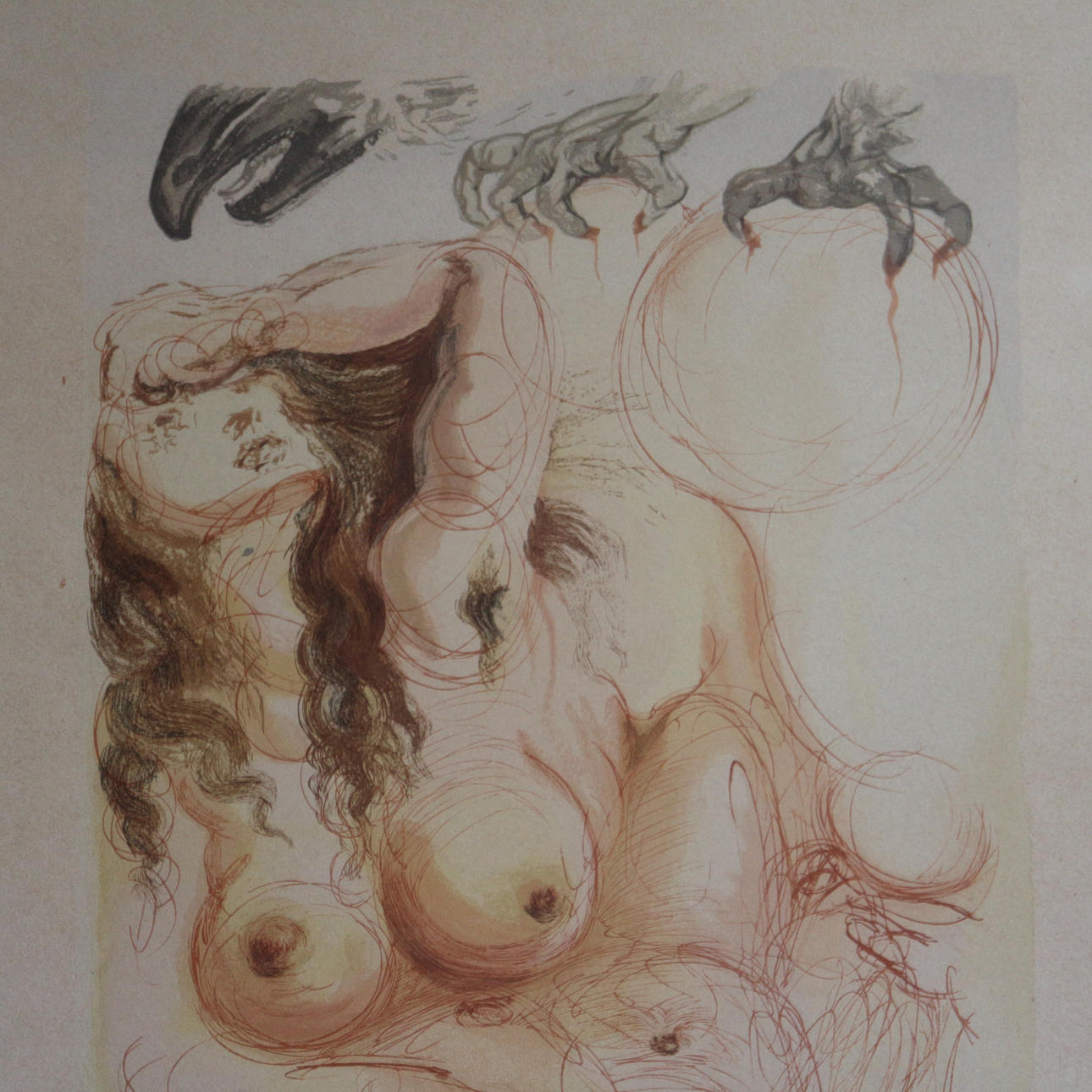 Salvador Dali, litografi, repræsentation af en kvindelig nøgen med en ørn, billedmål: 33,5 x 26,5 cm, rammemål: 36,5 x 43 cm, indrammet.