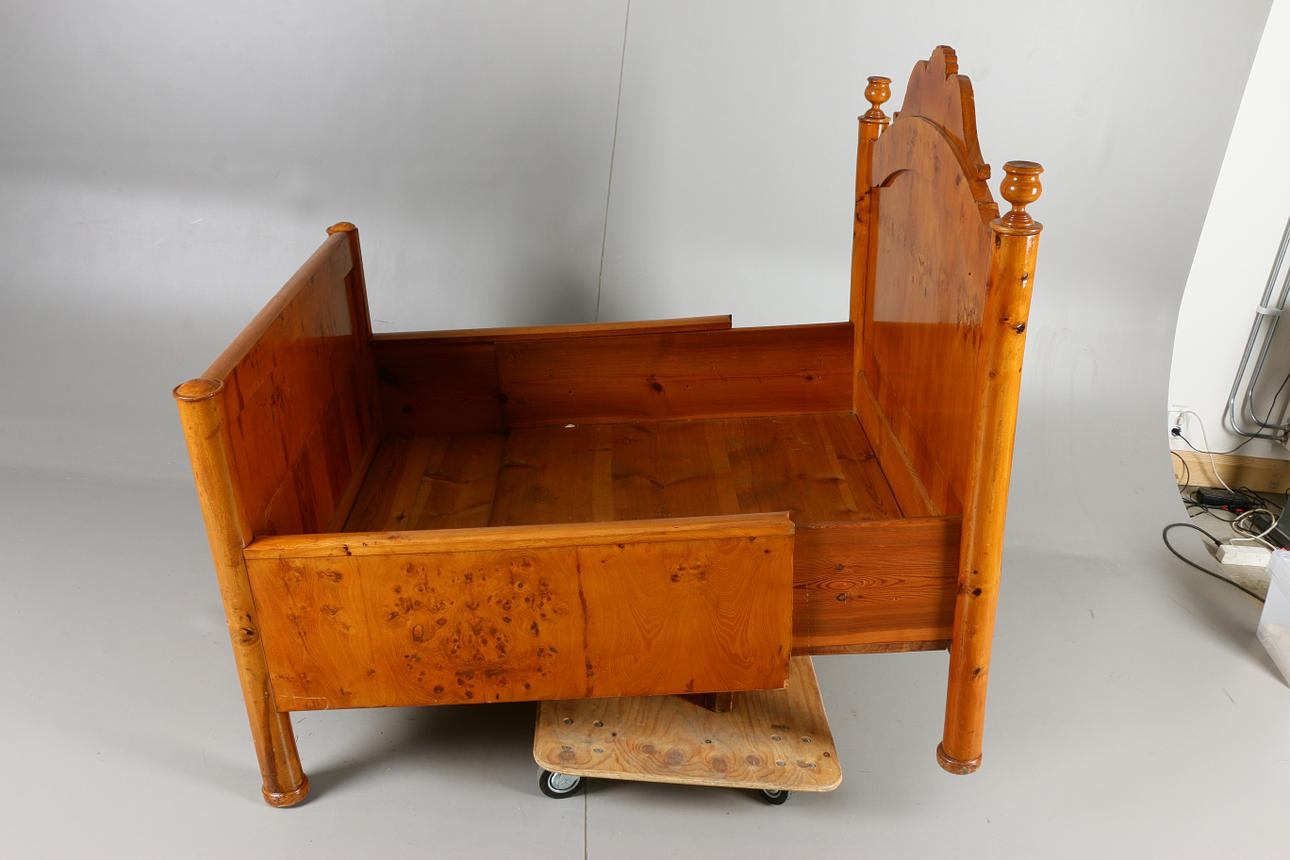 Seng med stel i birk Seng med længde 118, bredde x125-180, højde 127 cm.