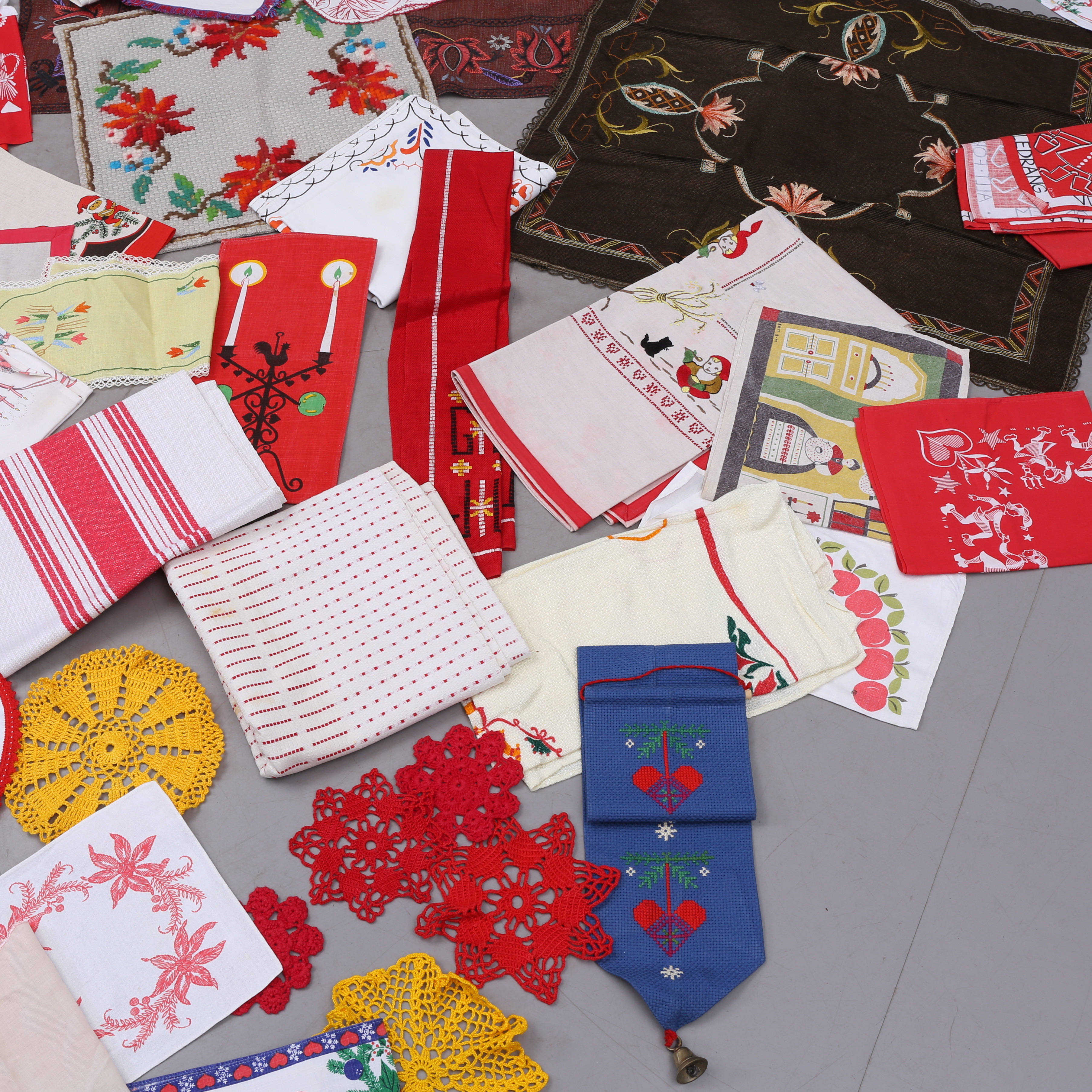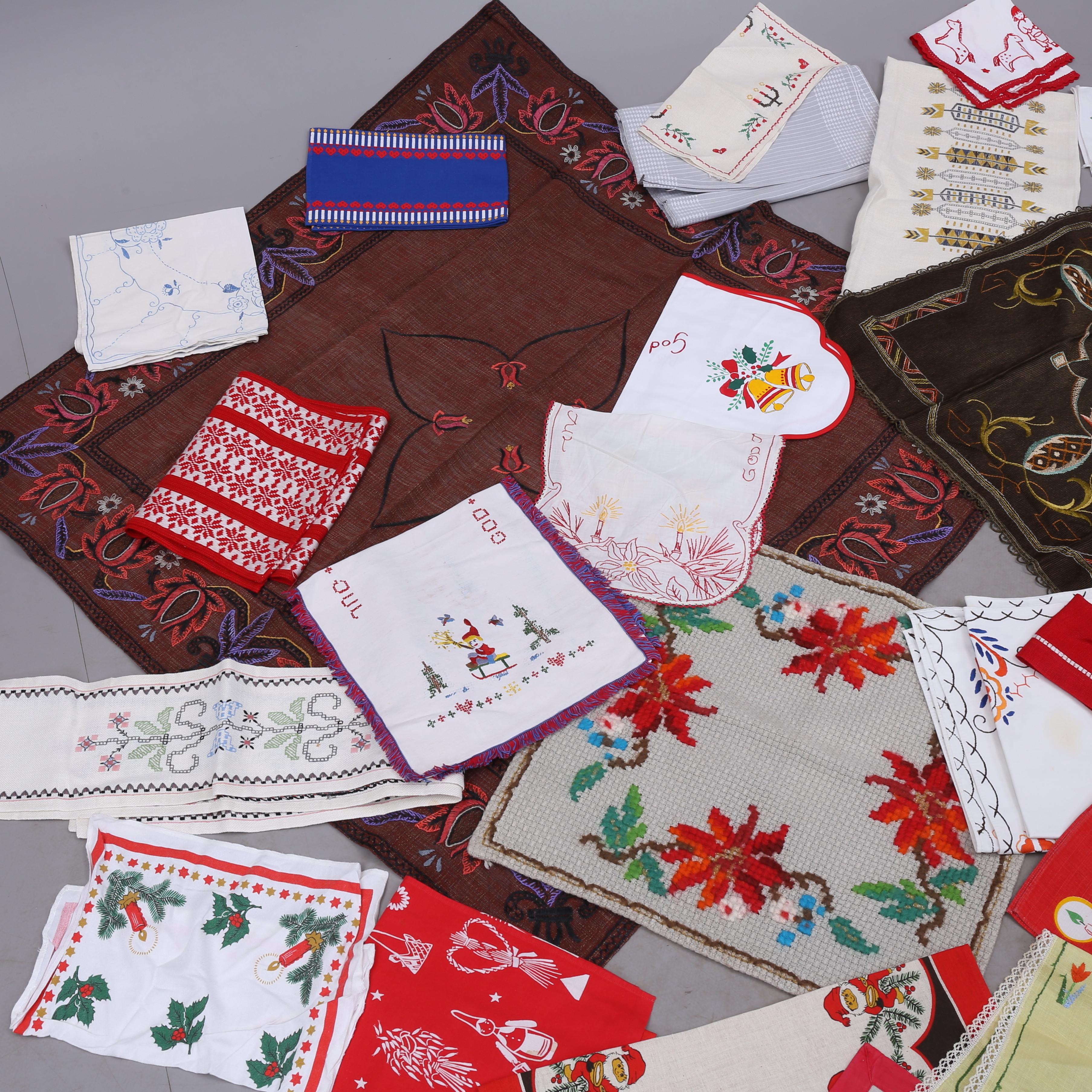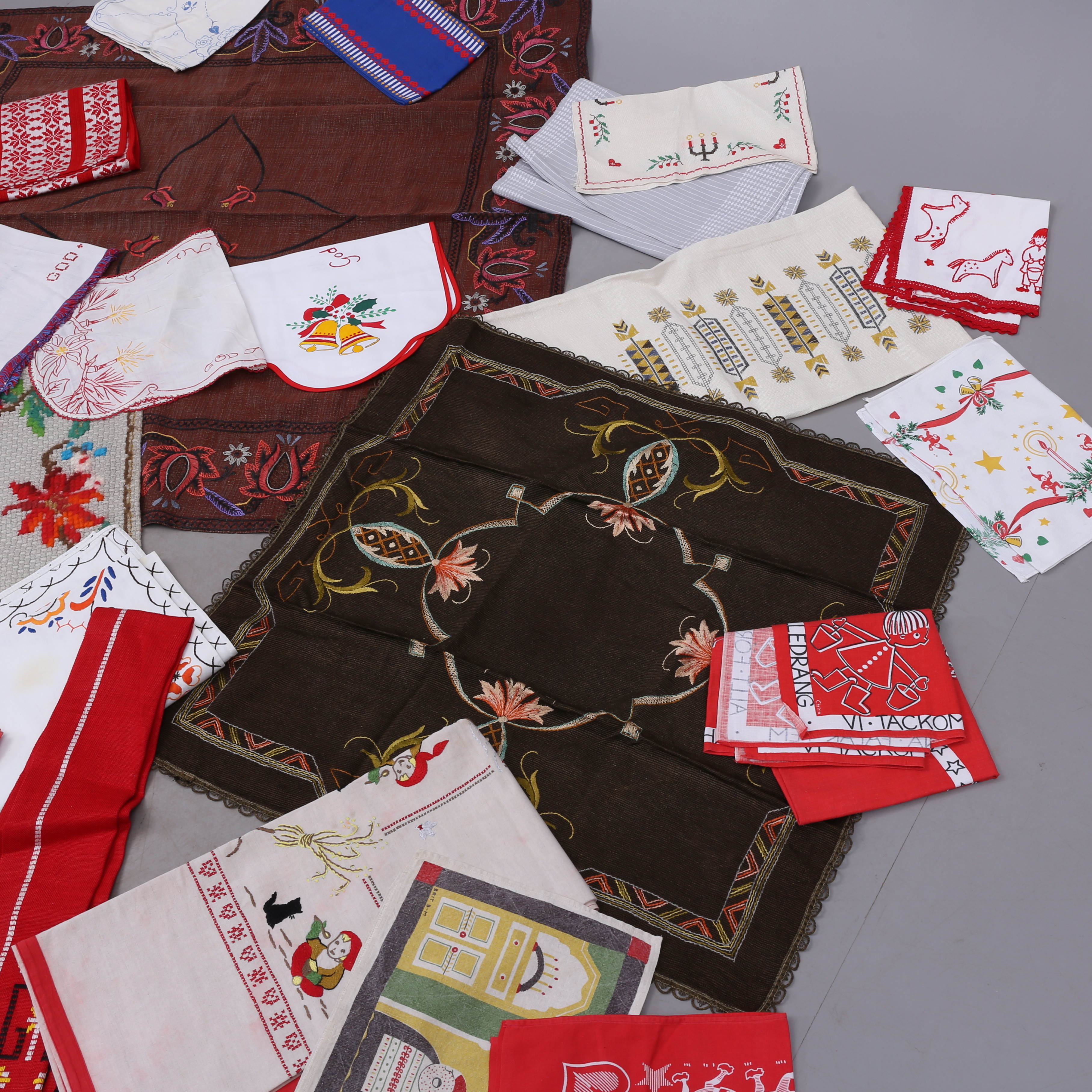 1373975. KLUDE, ca 40 stk., broderede, trykte, vævede, hæklede mm.