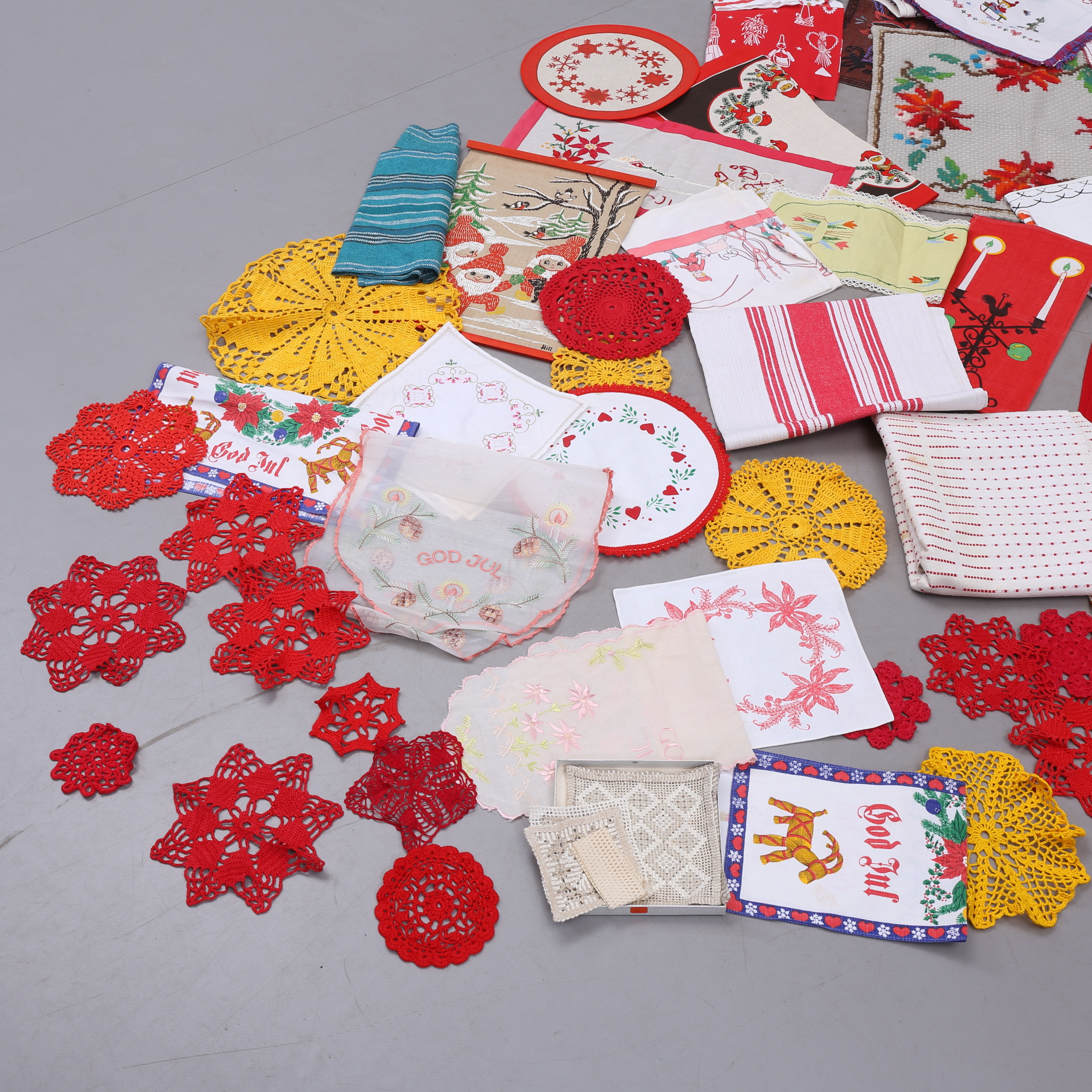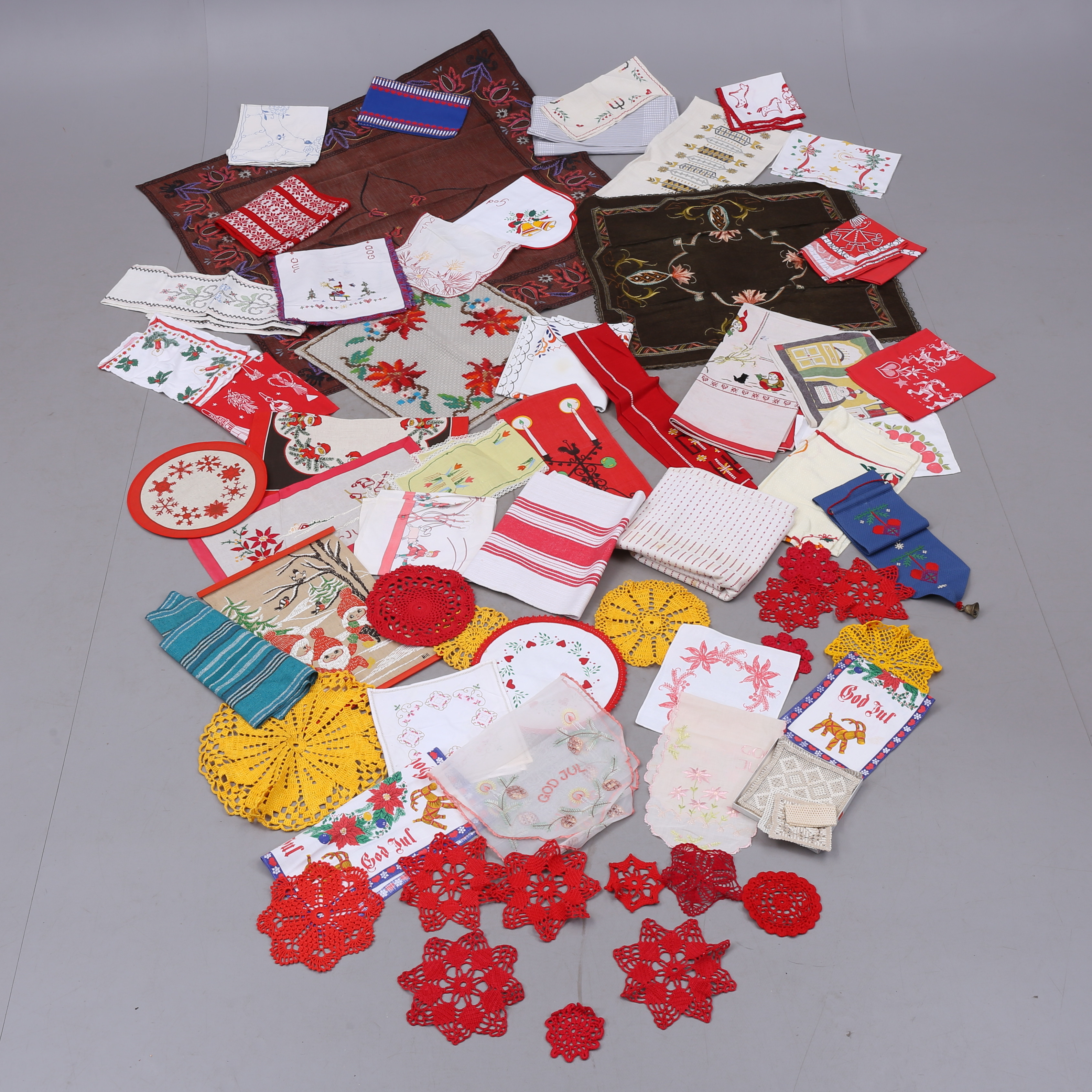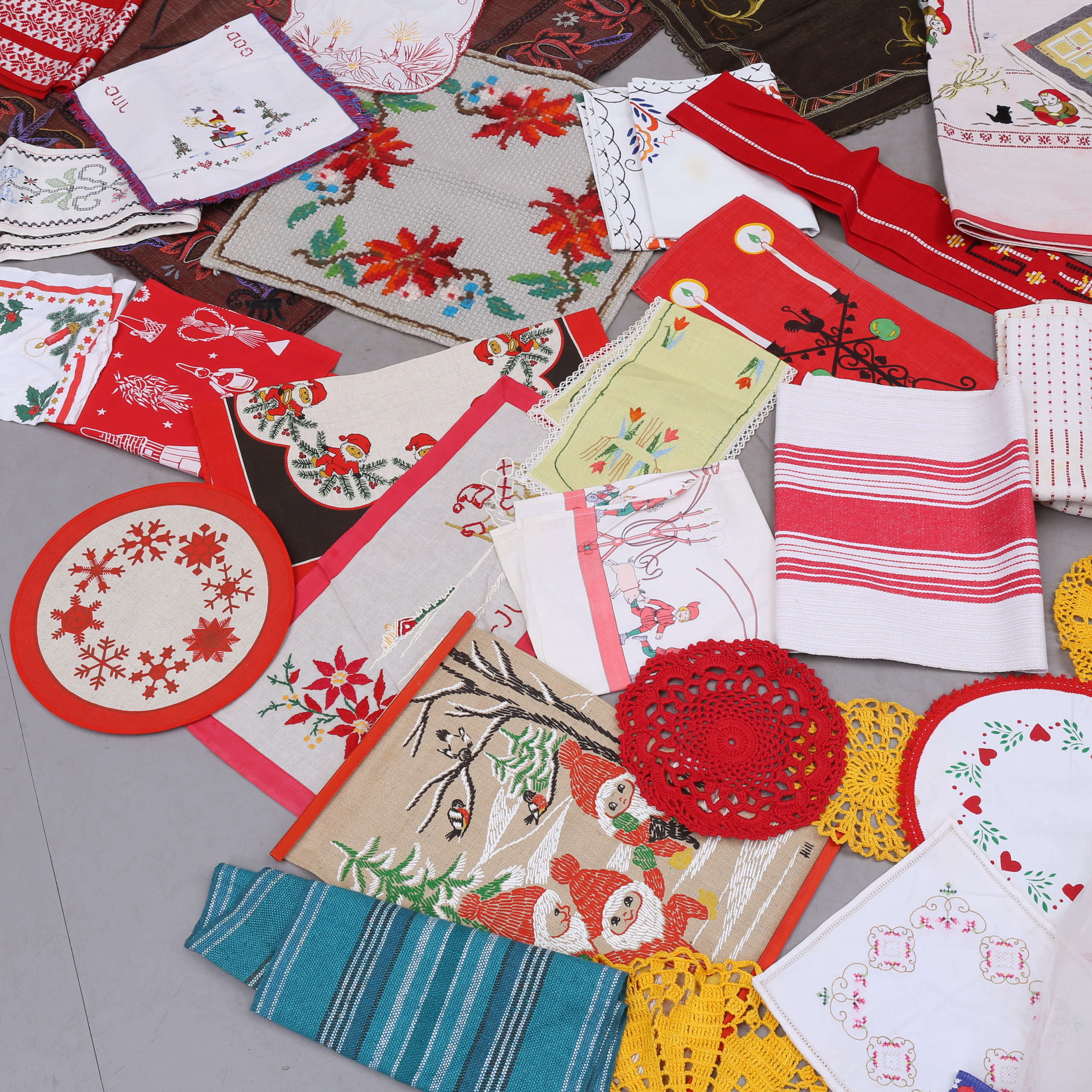1373975. KLUDE, ca 40 stk., broderede, trykte, vævede, hæklede mm.