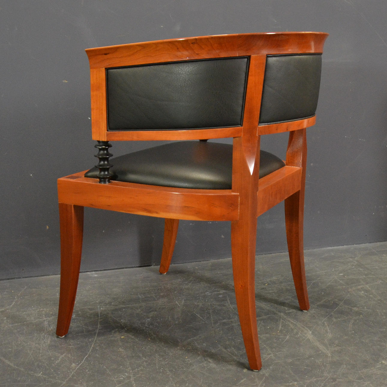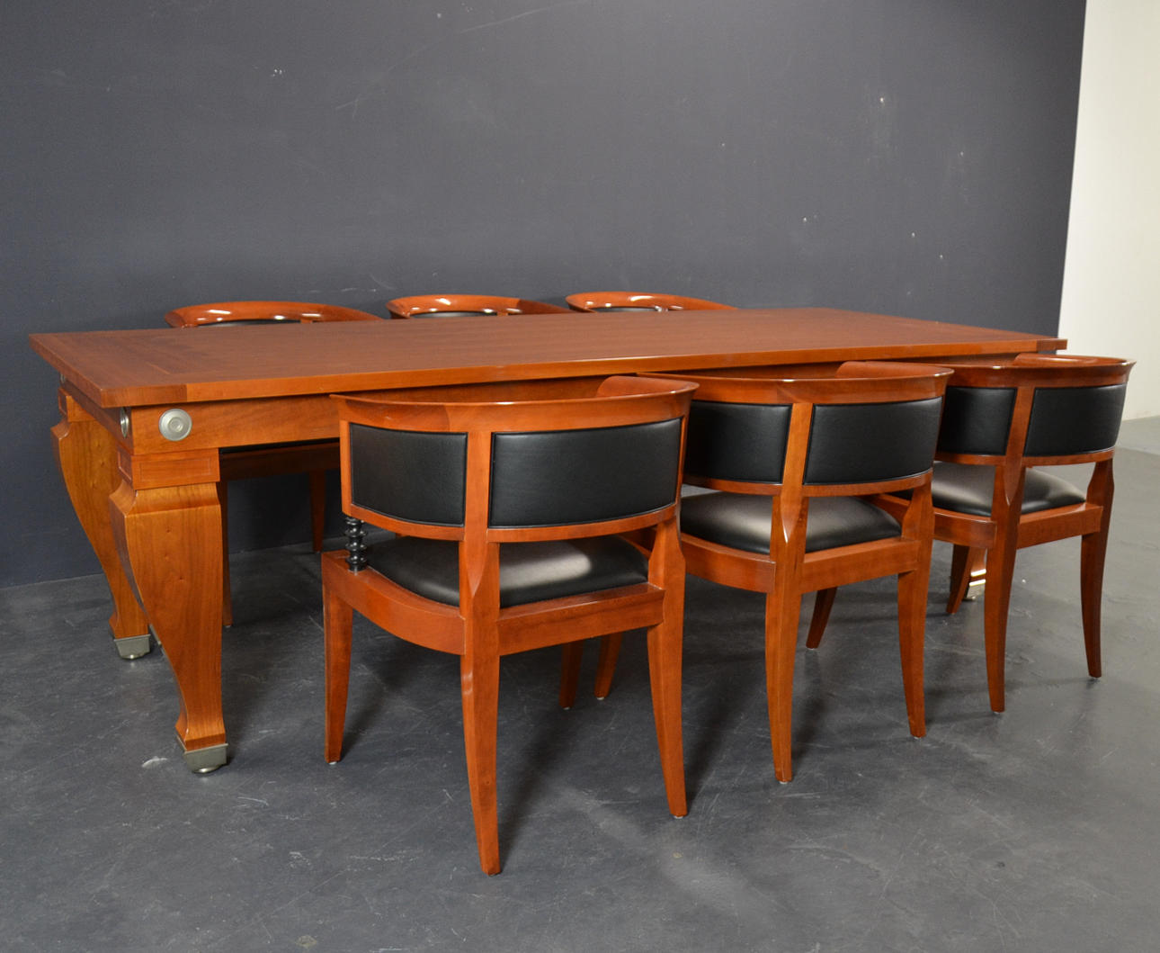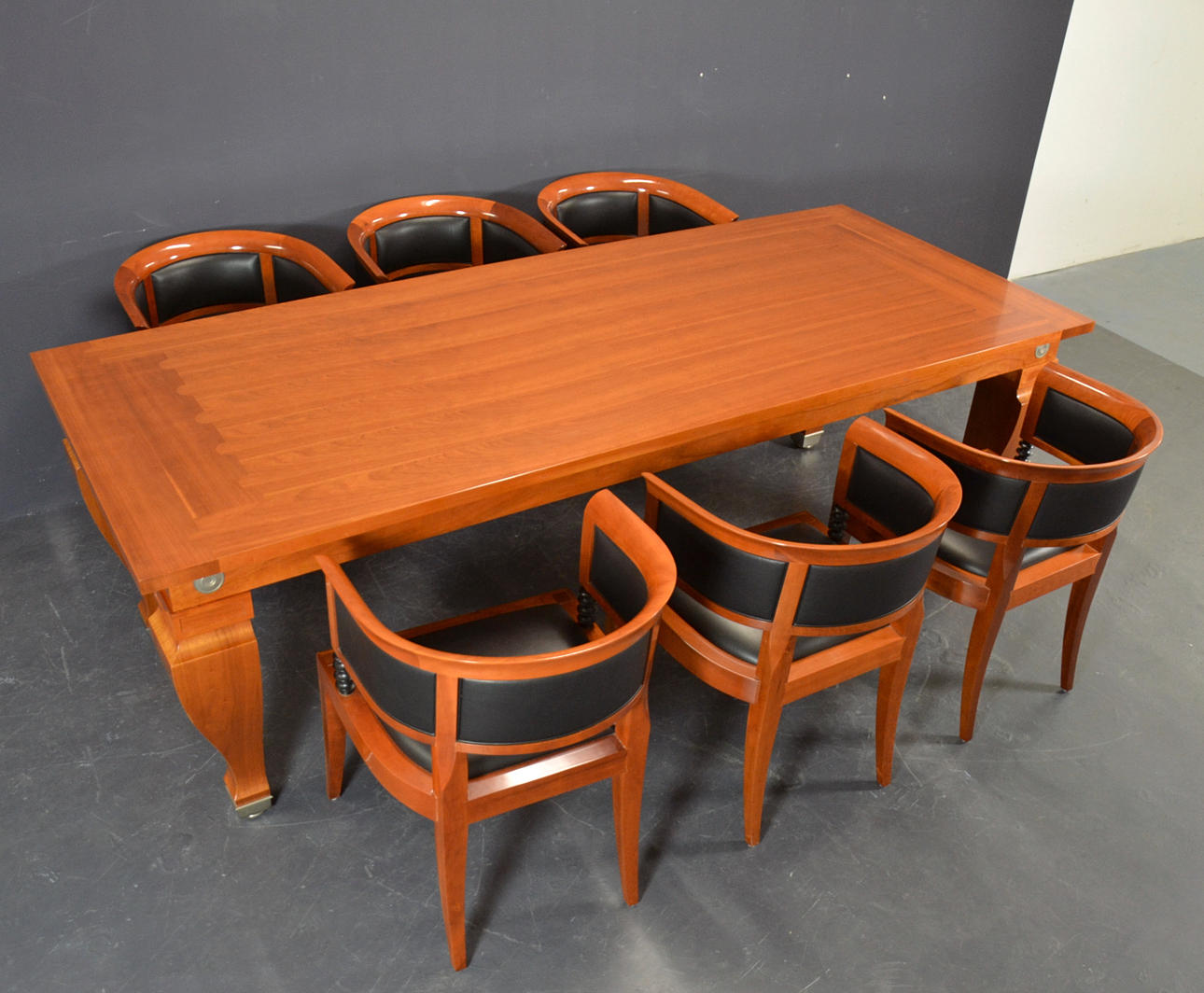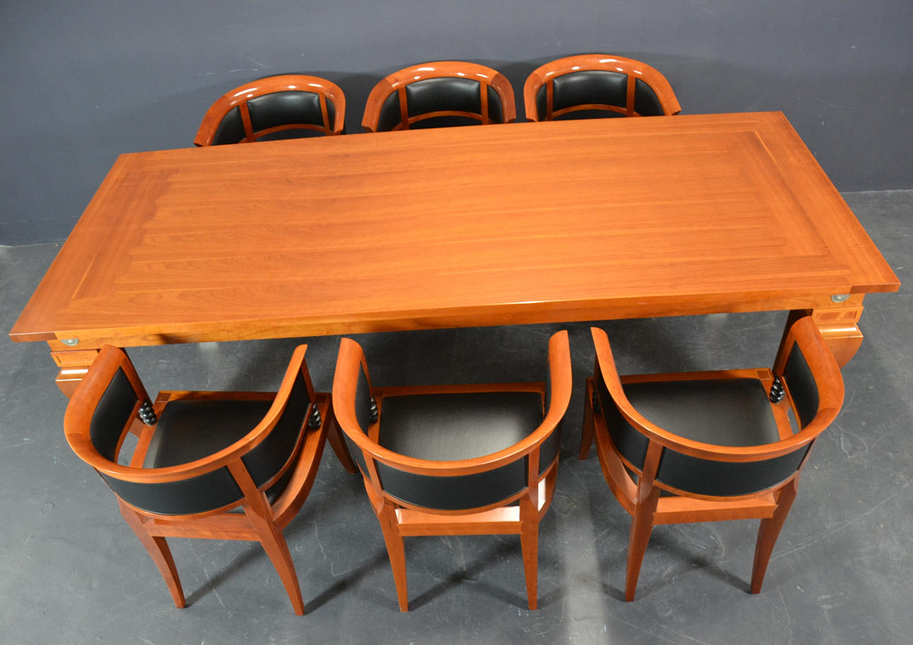 Fremstillet af massivt kirsebærtræ, stole betrukket med sort læder.