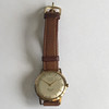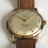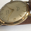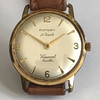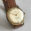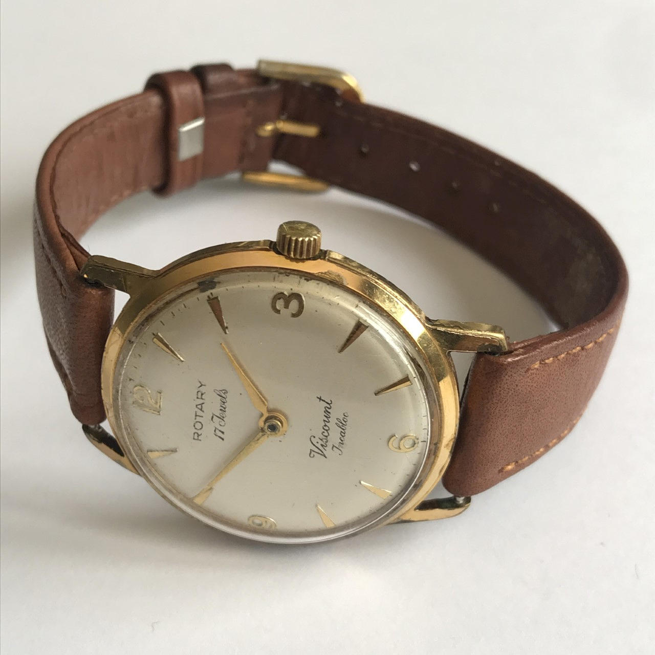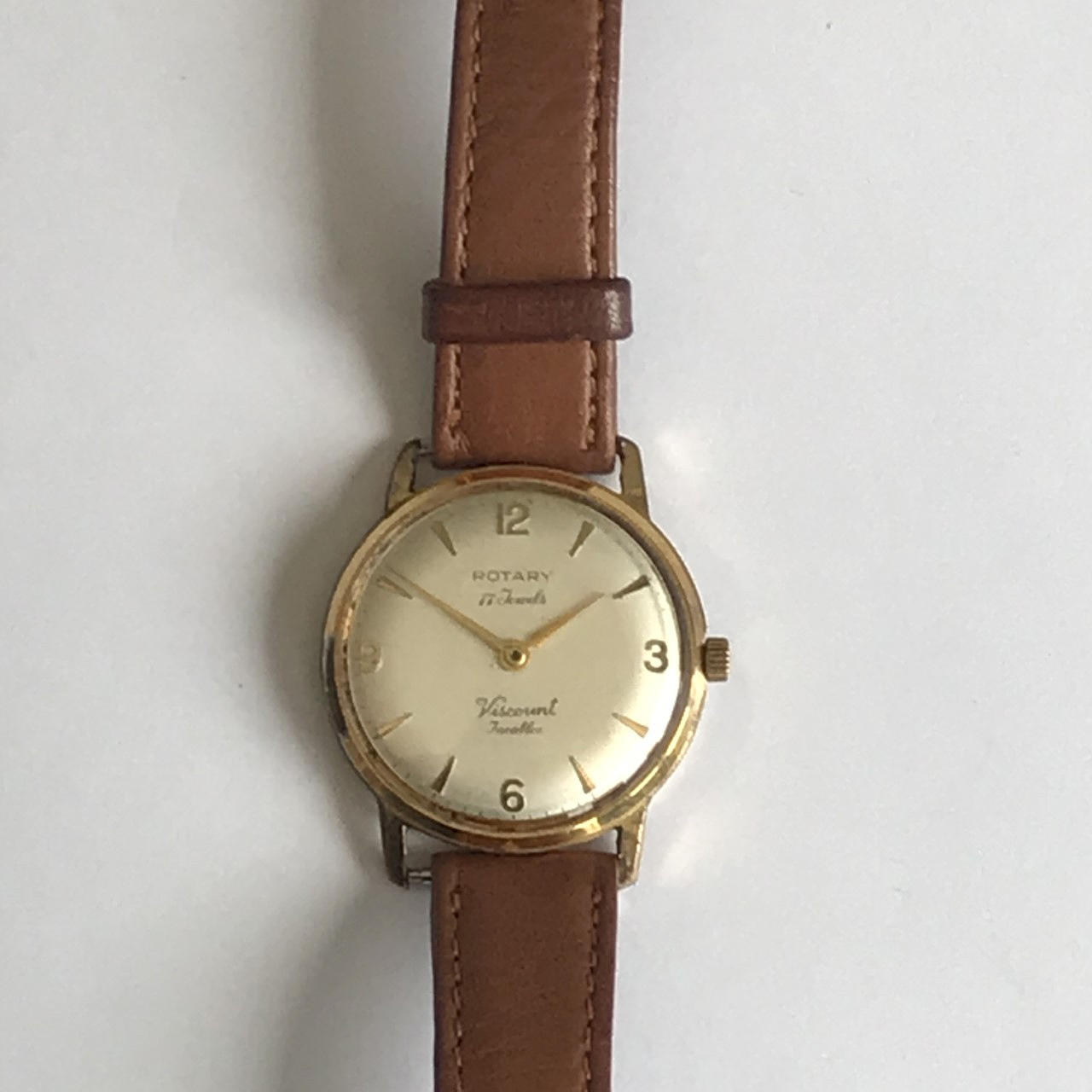 Et guldbelagt Vintage Rotary Viscount Incabloc 17 Jewels armbåndsur med brun læderrem.