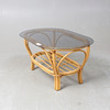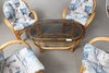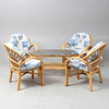 Bambus og flettet rattan. 4 lænestole. Bord med glasplade, længde ca. 120, bredde 74, højde 55 cm.
