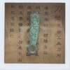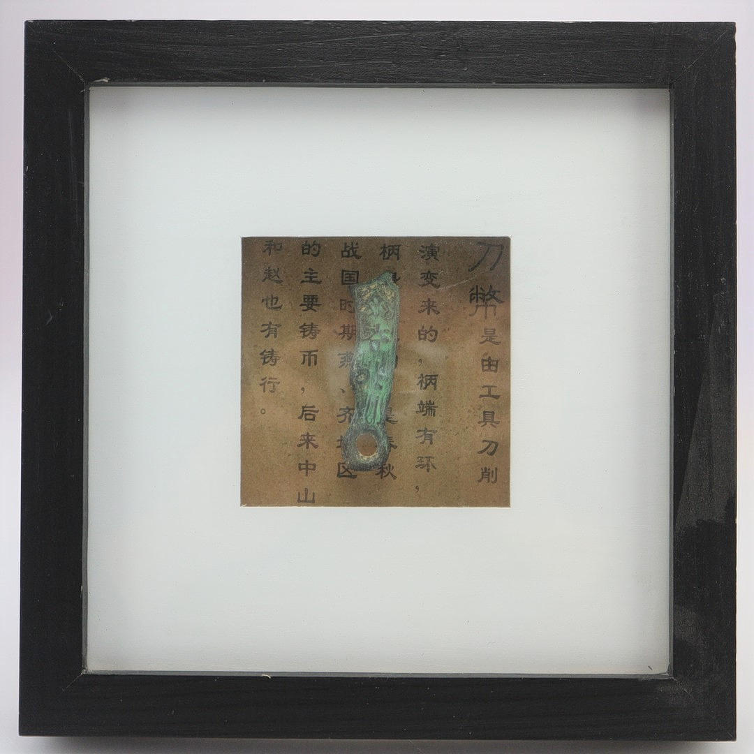 Antik kinesisk mønt, indrammet, Dao Bi, knivmønt, bronze, arkaisk periode i de kinesiske krigsstater (440 - 221 f.Kr.) i bronze, rammemål: 22 x 22 cm, billedudsnitsmål: 8,5 x 8,5 cm.