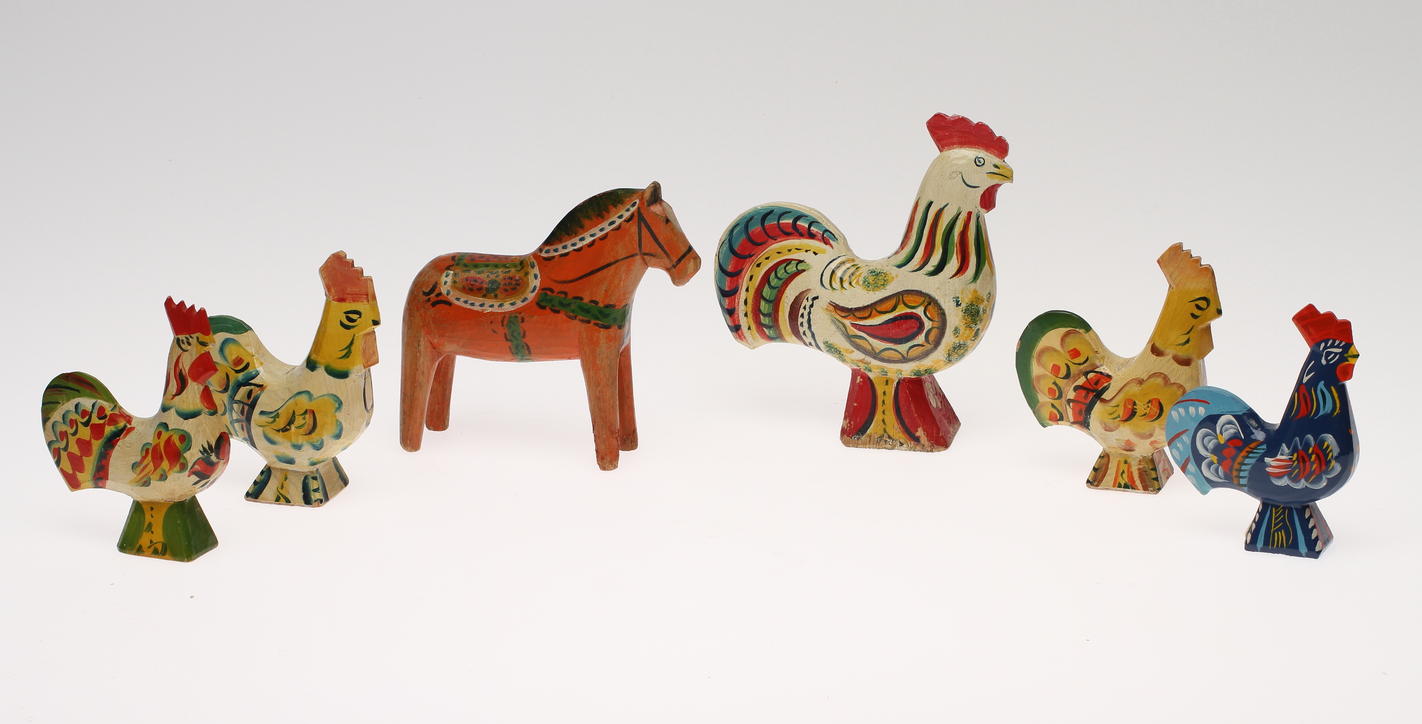 14102. DALATUPPAR, 5 stk og DALAHÄST, træ, malet.
