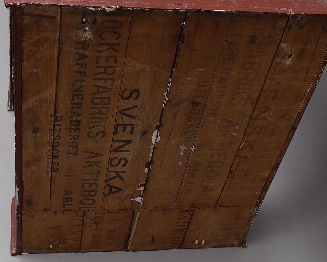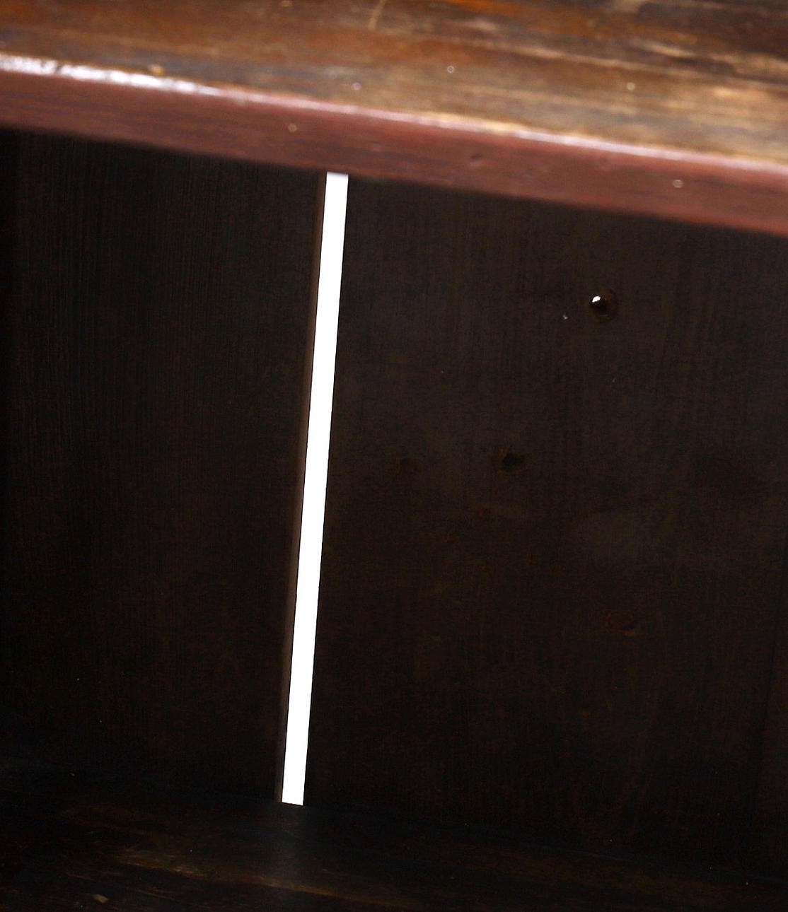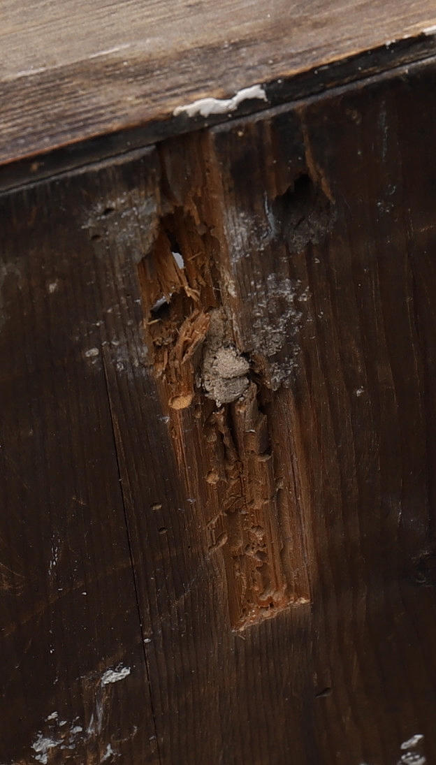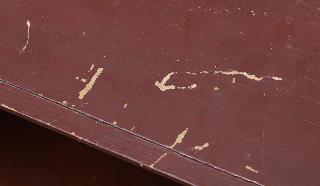 Slitage, skader på træet på bagsiden, malingstab.