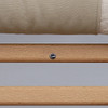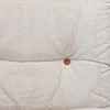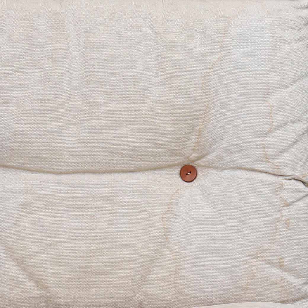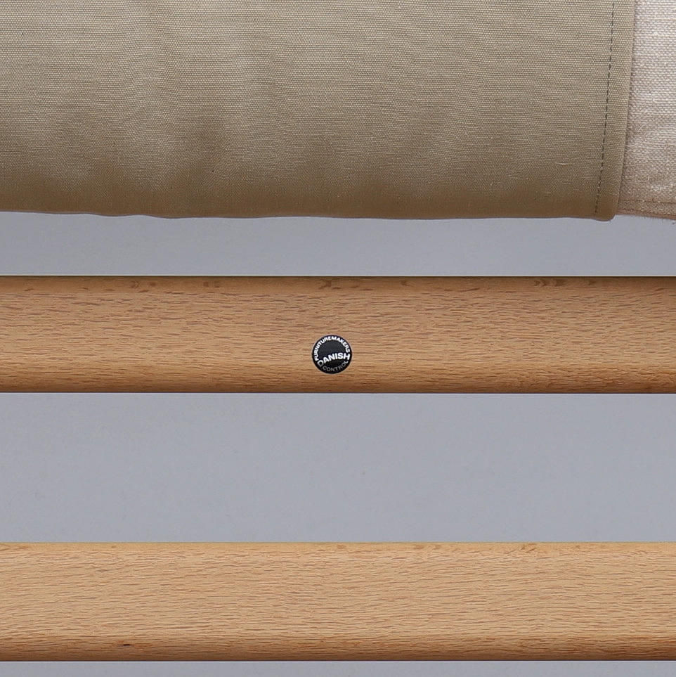 Løse hynder betrukket med lærred, læderknapper. Bredde 64 cm, højde 85, sædehøjde ca 40 cm. Mærket med dansk møbelsyn.
