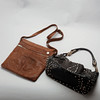 Brunt læder. To indvendige rum, hvoraf det ene har lynlås. Mærket: Adax. 30 x 33 cm.