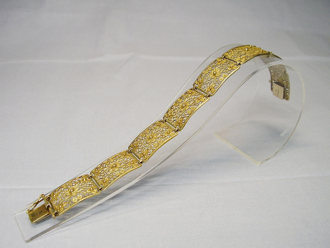 Den er lavet af 8 rektangulære led, der er fleksibelt forbundet med hinanden via stropper. Linkene er bearbejdet i den fineste filigranteknik. Armbåndet åbnes af et tungespænde med sikkerheds otte.