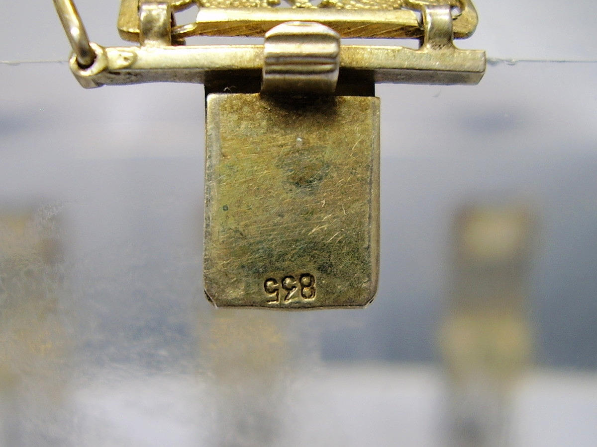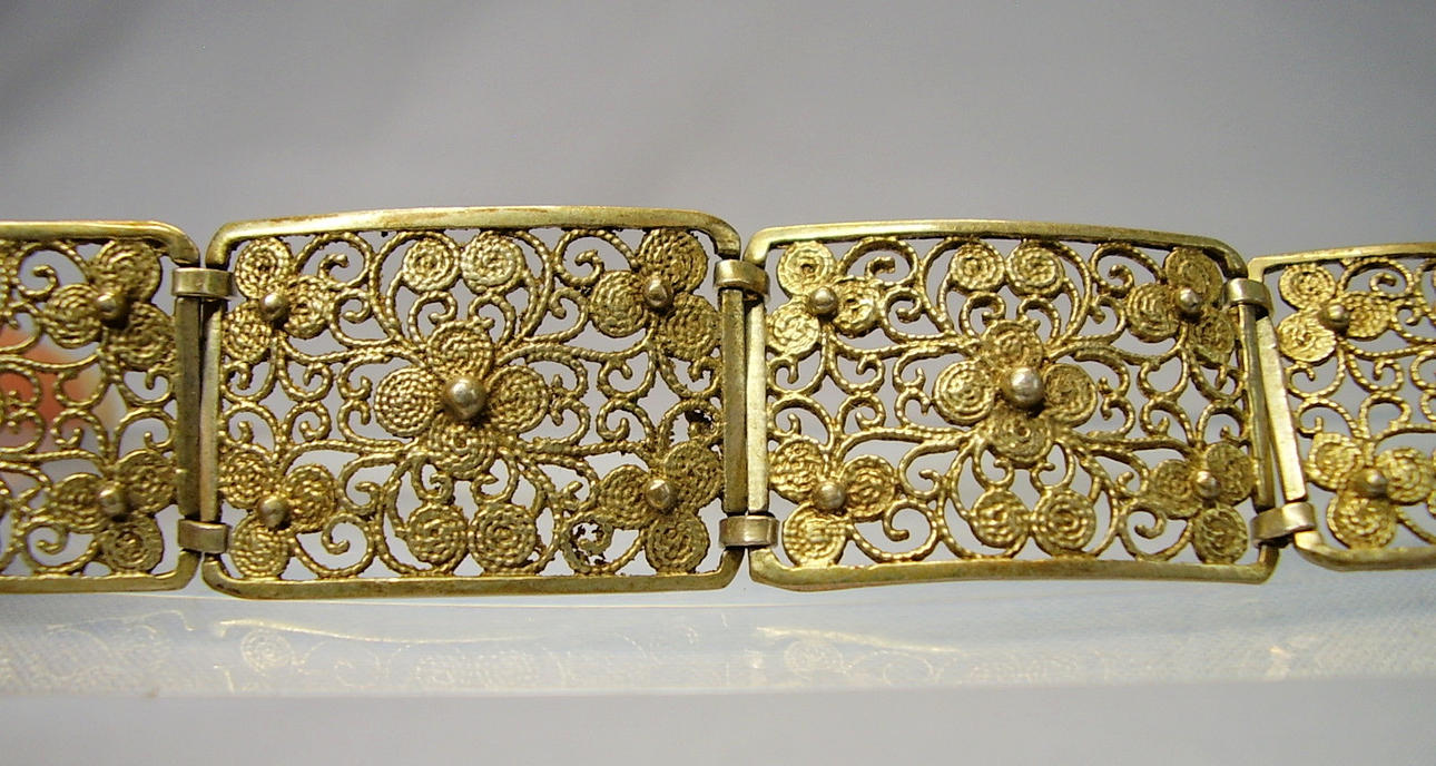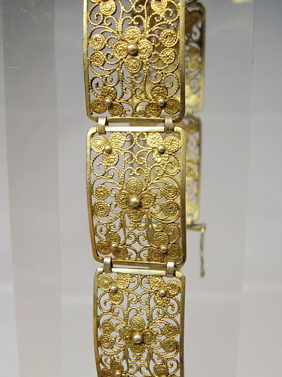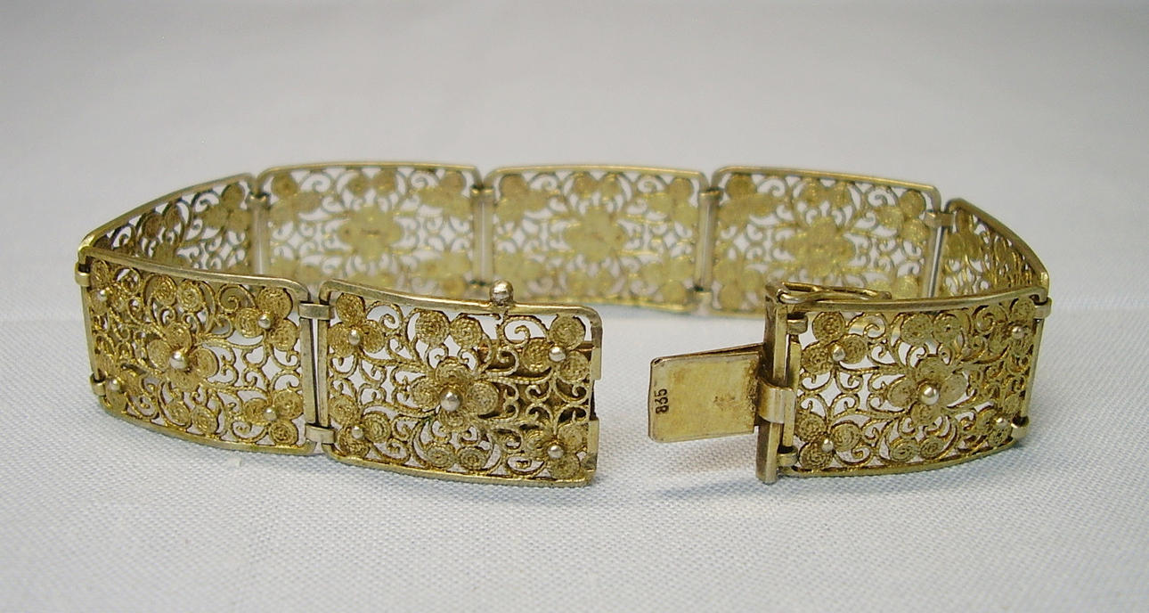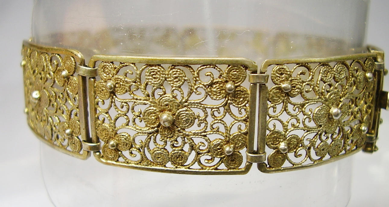Det antikke filigranarmbånd er lavet af 835 sølv og stemplet, og det er fuldstændig forgyldt i gult guld.