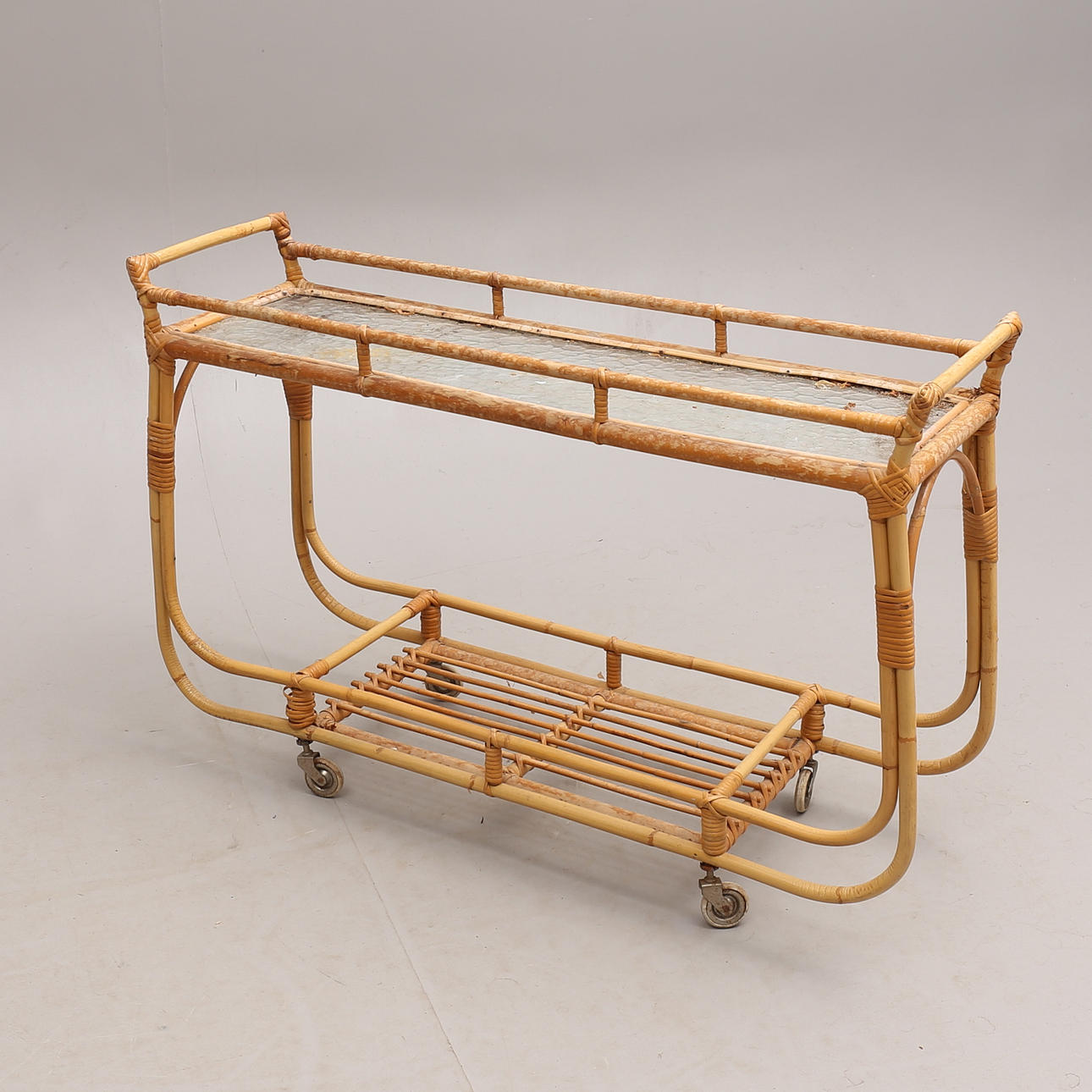 Blomsterbord med slid, delvist løse hjul. Sokkel med mindre brugsspor.