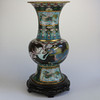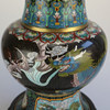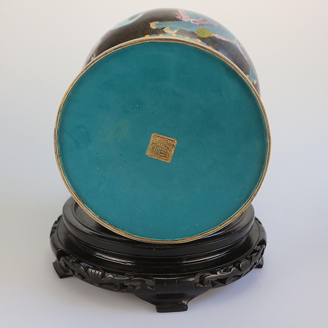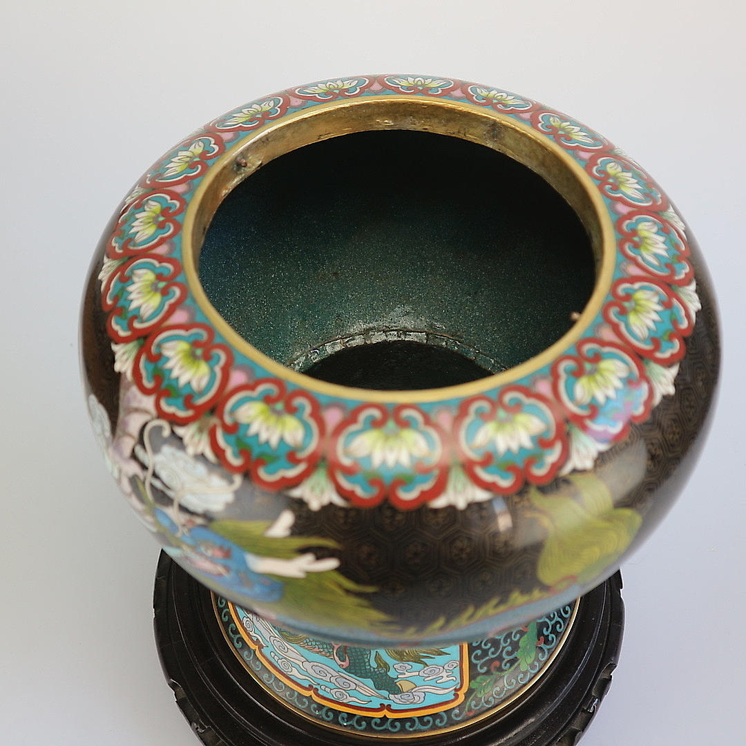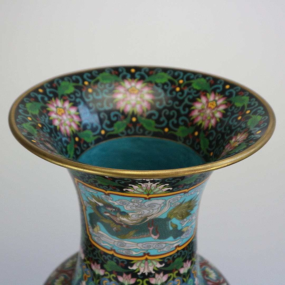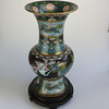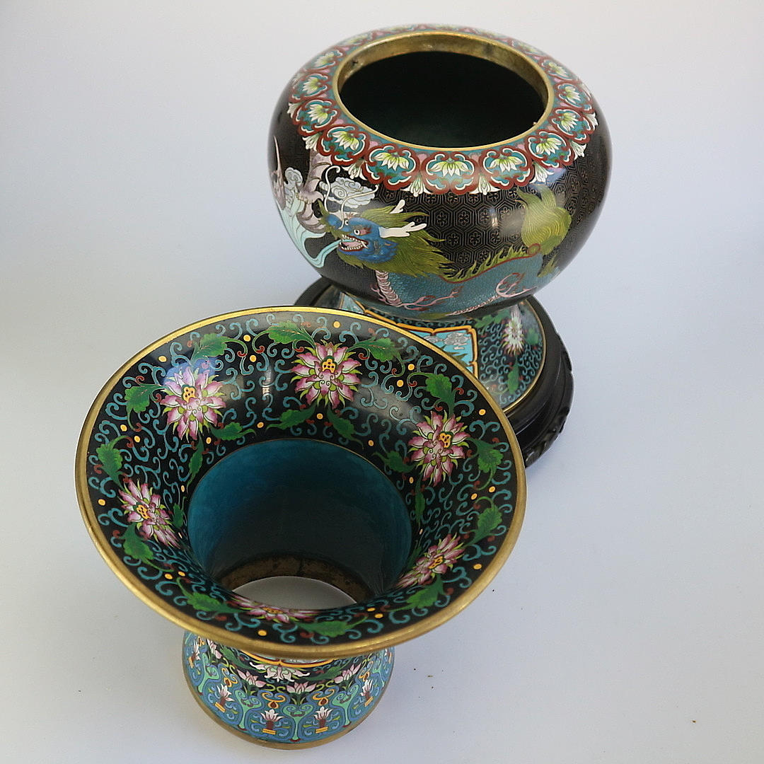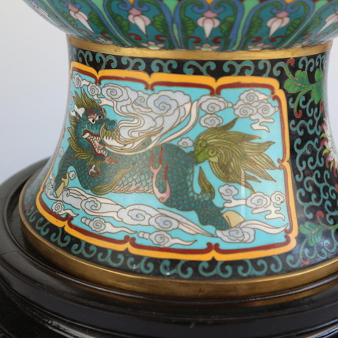 Cloisonné vase Kina, begyndelsen af 1900-tallet, kobber med emaljeværk, dragemotiv, træfod, i alt 3 dele, stempel under overdelen, højde: 59 cm.
