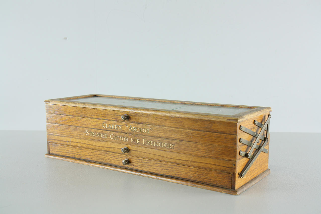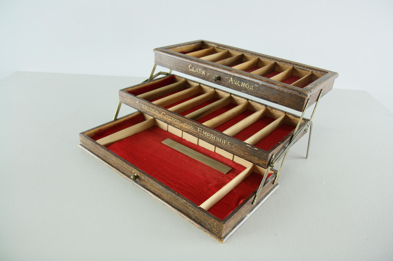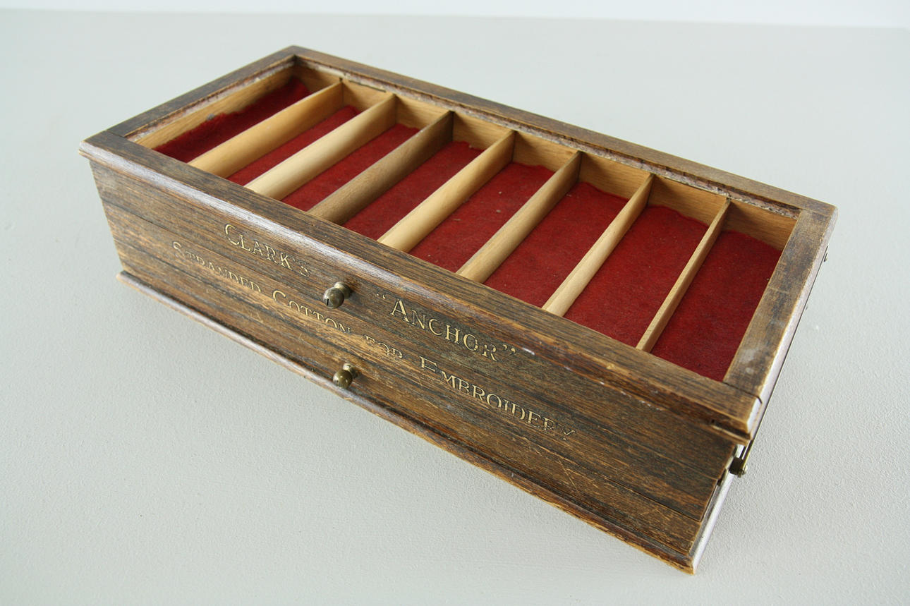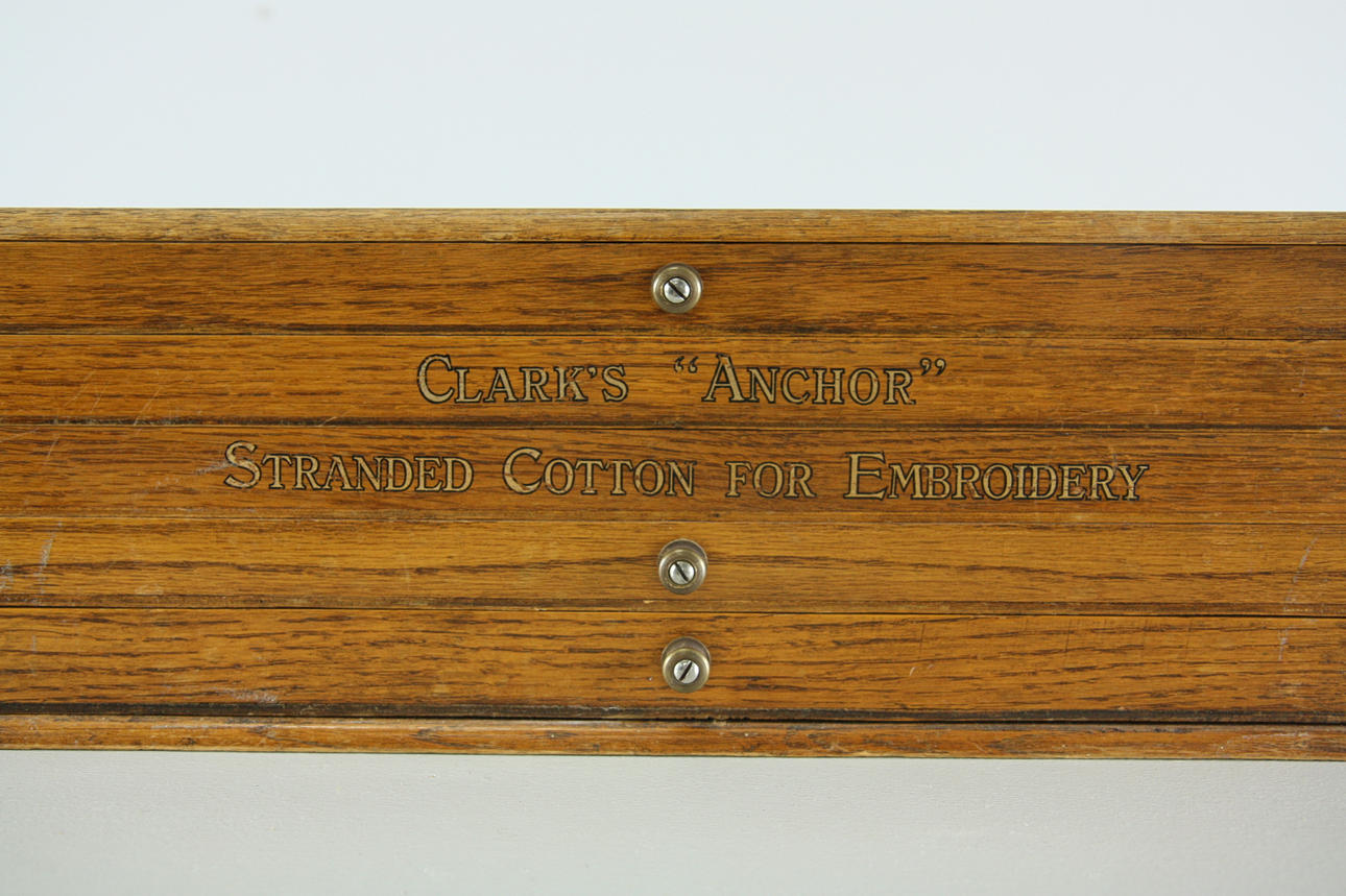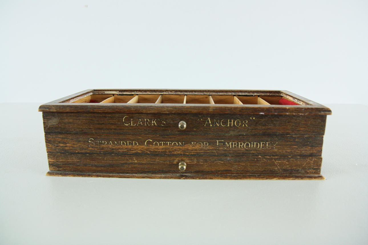 1 stk, Clarks "Anchor" strandet bomuld til broderi, længde 57 cm, højde 19 cm 1 stk, "Listers Perfection", længde 40 cm, højde 17 cm 1 stk, Clarks "Anchor" strandet bomuld til broderi, længde 41 cm, højde 11 cm Fremstillingsbutik, Tenhult Småland.