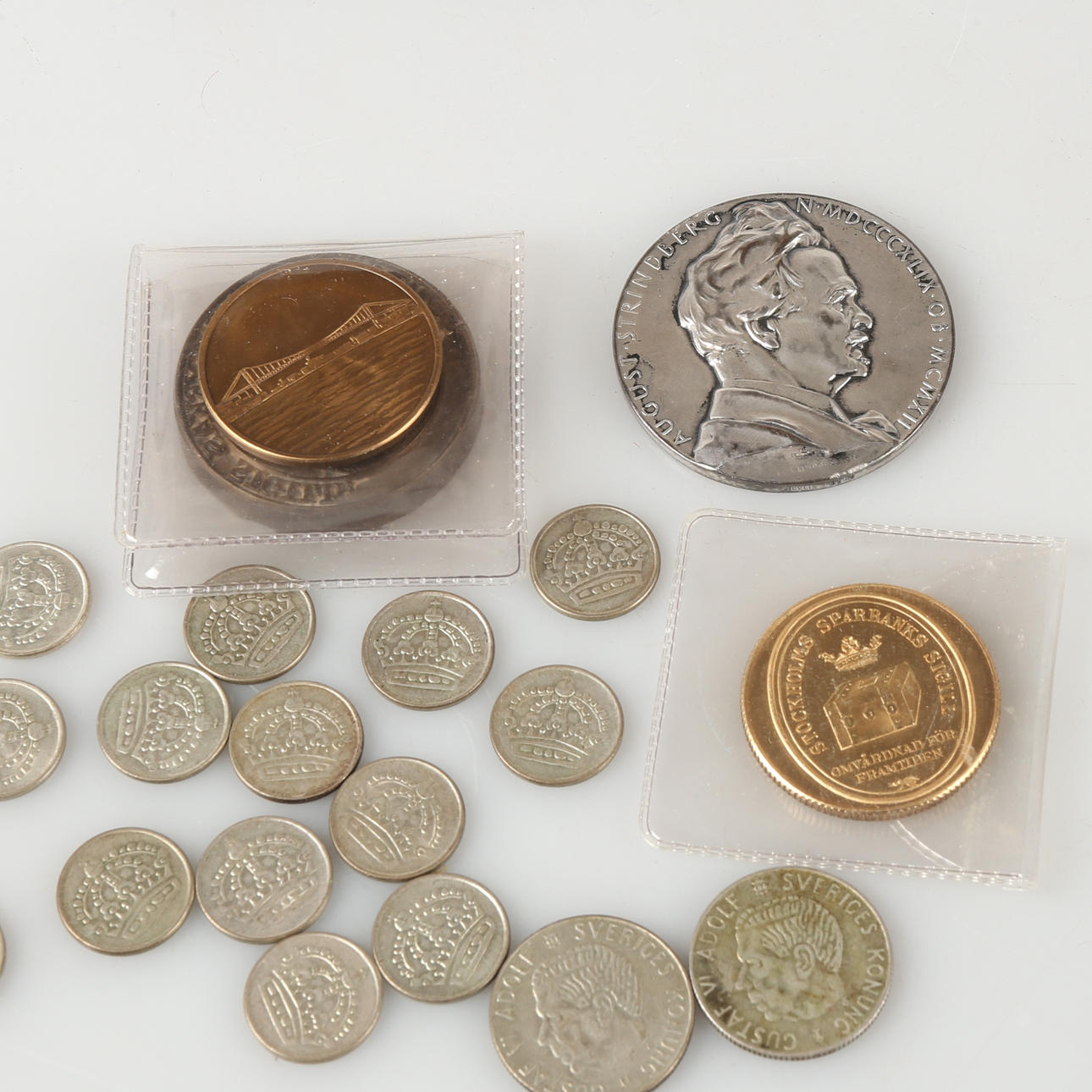 7 SEK 5 sedler, 1974-1981 2 SEK 10 sedler, 1988 Sølvmønter 2 SEK 1, 1955, 1961 14 10 öre, 1952-1961 Møntvægt 46,5 gram "August Strindberg N MDCMC1IIIX gram 46,5 gram "August Strindberg N MDCMC1IIIX gram 4,39 gram, 19, 19, 19, 1950 Sveriges Riksdag, til minde om fem århundreder helliget rigets og folkets pleje 1935 Tildeling af medalje ved det almindelige landbrugsmøde i Stockholm 1868, Carl XV. Konge af Sverige og Norge Tildeling af medalje ved det almindelige landbrugsmøde i Malmø 1881 Den 1. juli, 1941, Ystads jernbaner blev til statsbaner, Med taknemmelighed til virksomhedens stiftere ledelsespersonale Sveriges almindelige kunstforening 1832-1932, Axel Gabriel Bielke, Axel Edelstam Skånsk panteforening stiftet 1836-1936, Carl Adolf Agardh Skåne gymnastikforening 9 å Lånjunge Gymnastikforening 9 å Lånjunge Gymnastikforening, 1836-1936. Billesholms Aktiebolag, Bredsigt og succes prægede hans 50-årige indsats i virksomheden, Gustaf Tornerhjelm "Til Gustaf Rydberg på hans halvfemsindstyvende fødselsdag D.13. sept.1925 fra venner og beundrere af hans kunst" Gøteborg 350 år 1971 "1 Miljard, Stockholm Sparekasses segl, omsorg for fremtiden" Maria-Magdalena-Marknad 1978, lokal mønt 10 kroner Åhus Stempel: Ystads ST:Mariae Kyrkas Segl.
