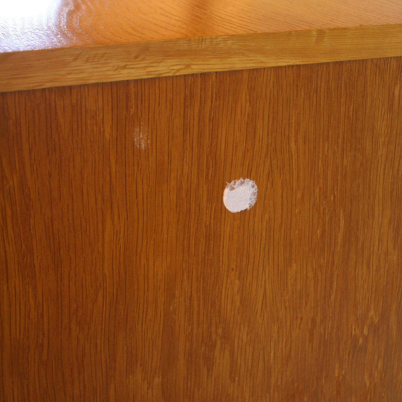 Brugsslitage, rester efter 1 møbelpote på siden. skrevet på boksens kanter.