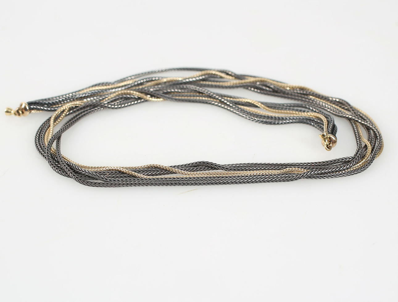 Længde 45 cm 2 kæder 14 K guld, 4 kæder oxideret sølv Original æske.