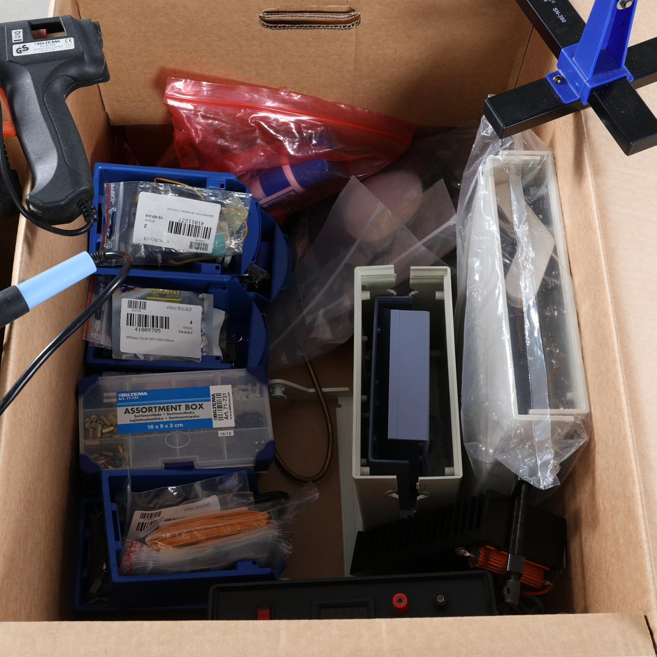 1 boks indeholdende: stik, transistorer, køleplader, gummiknopper, modstande, flexslange, transformer, jack stereo chassis, metal stereostik, kabler, testprobe, termisk pasta mv.
