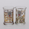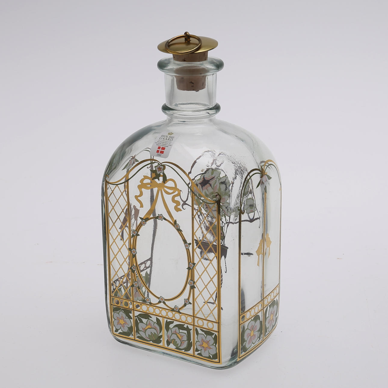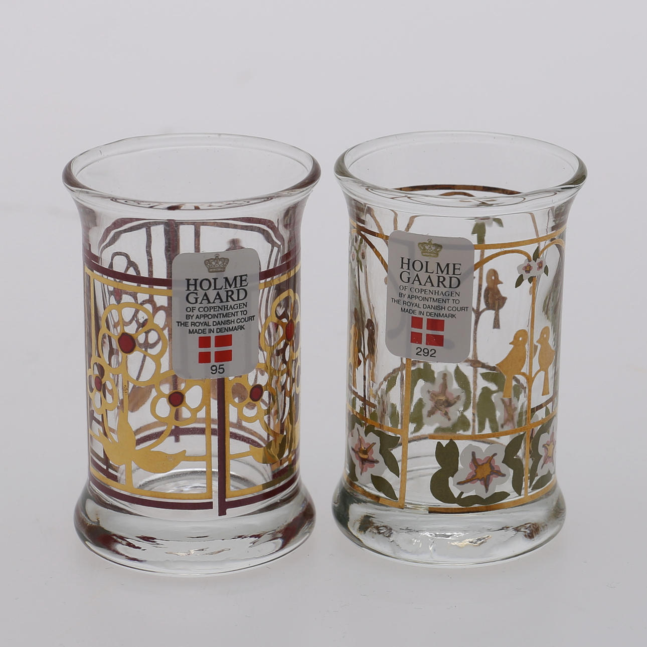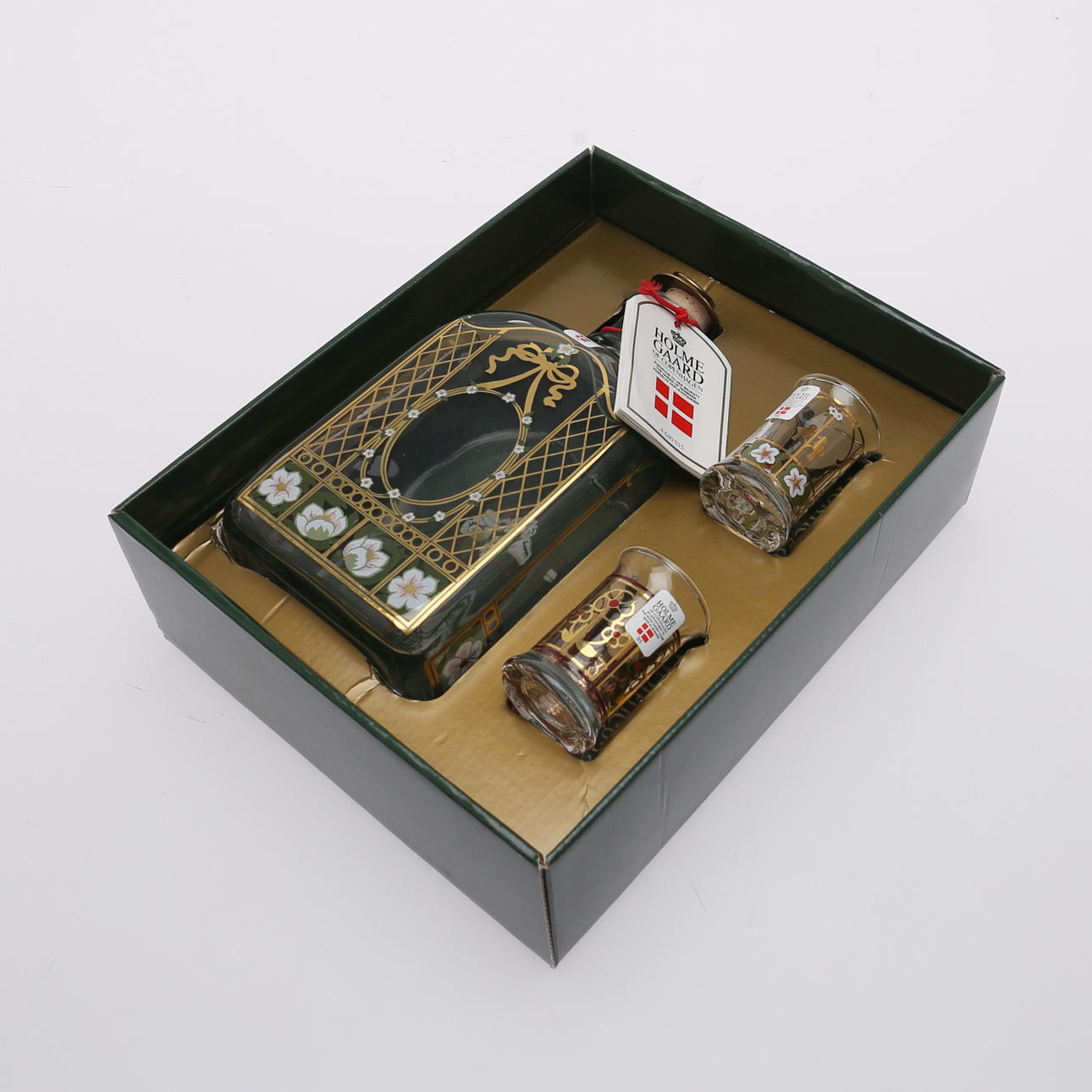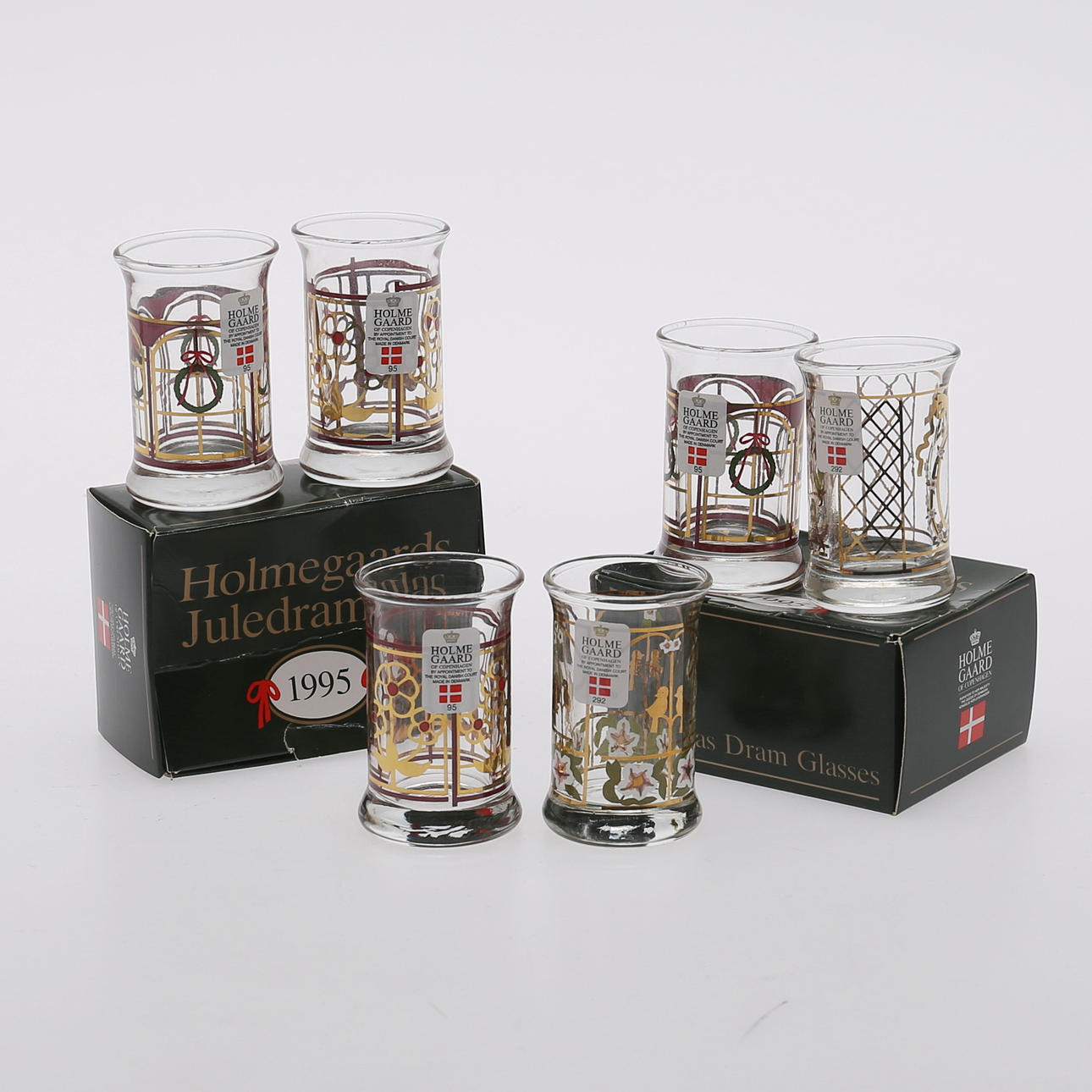 Flaskehøjde 18 cm, glashøjde 6 cm. Snapseflaske med 2 glas, Holmegaard, Danmark, 1993 4 glas, Holmegaard, Danmark, 1995.