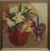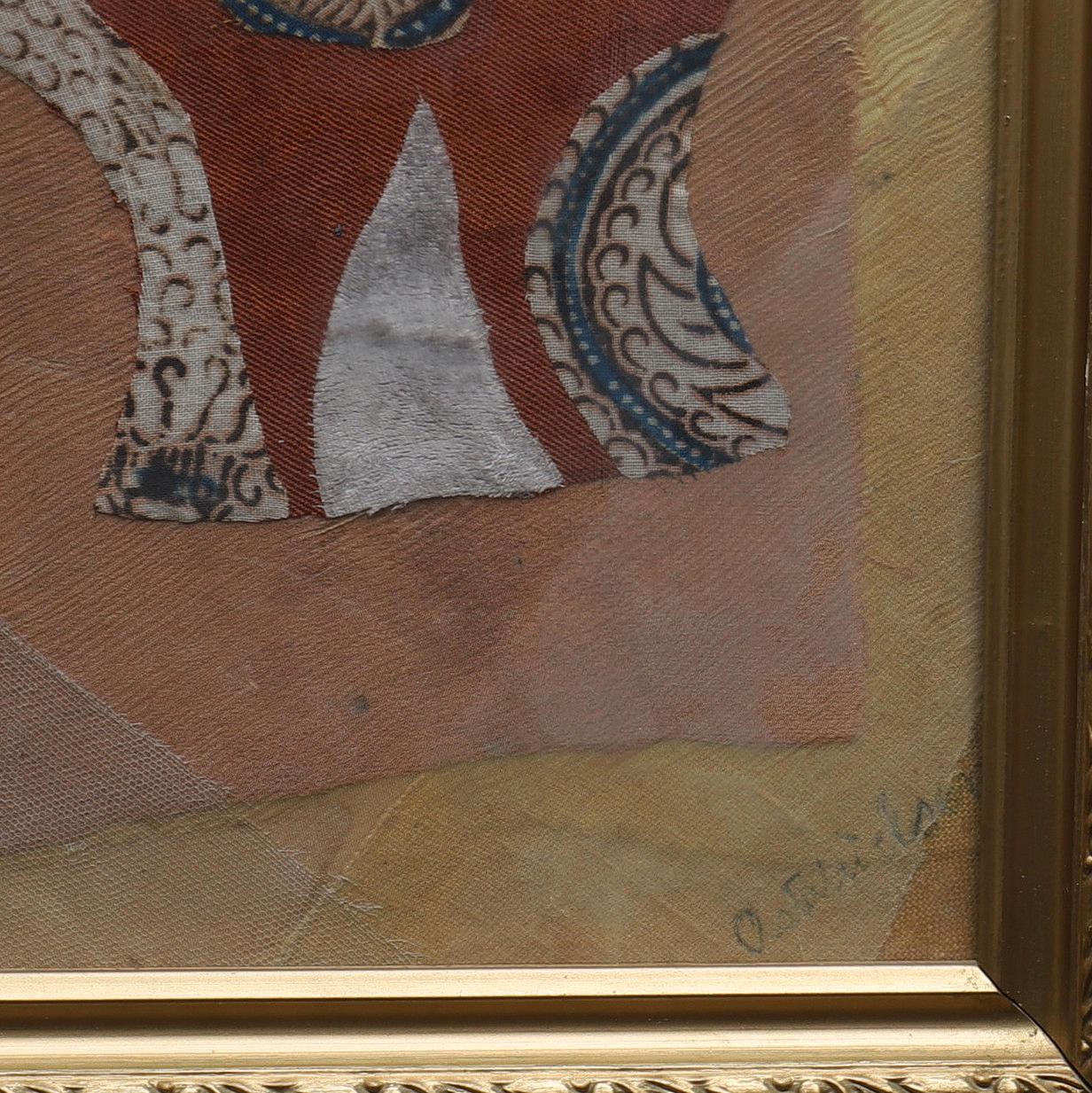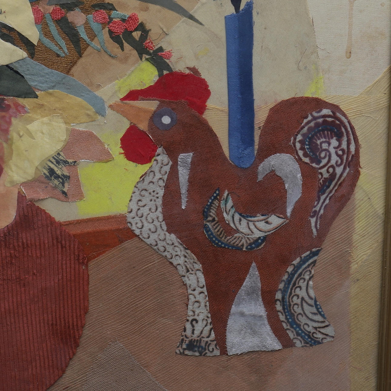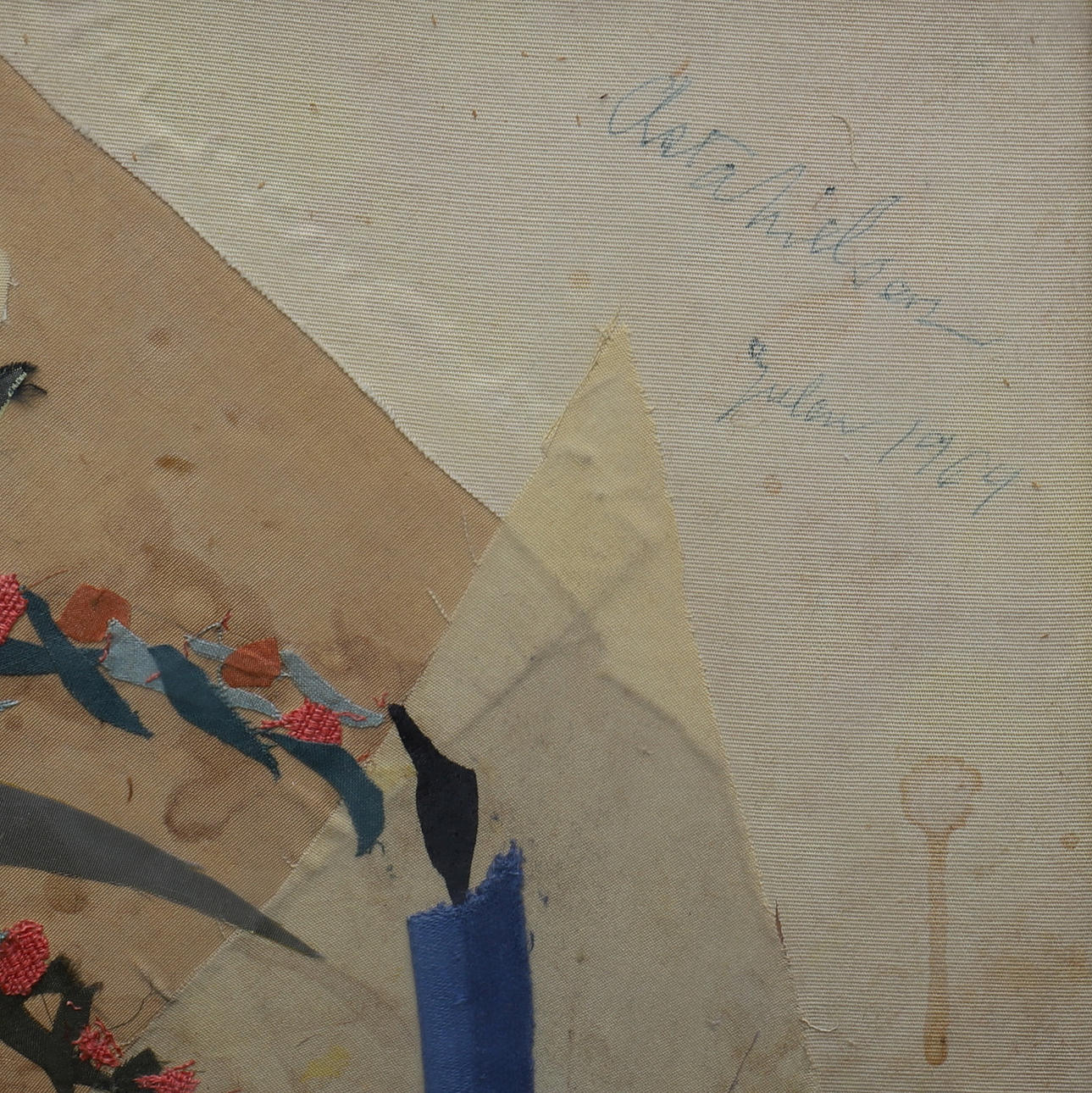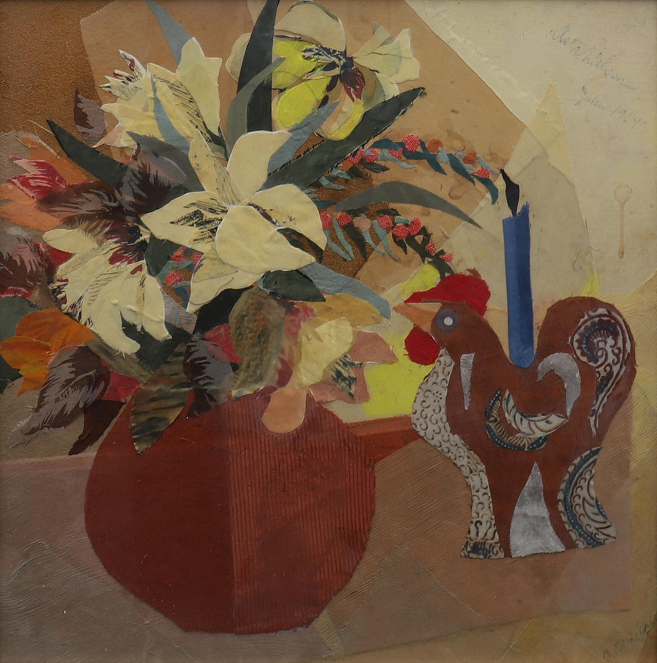 Signeret, og dateret jul 1964, applikation/collage med stoffer, ca 43x43 cm.