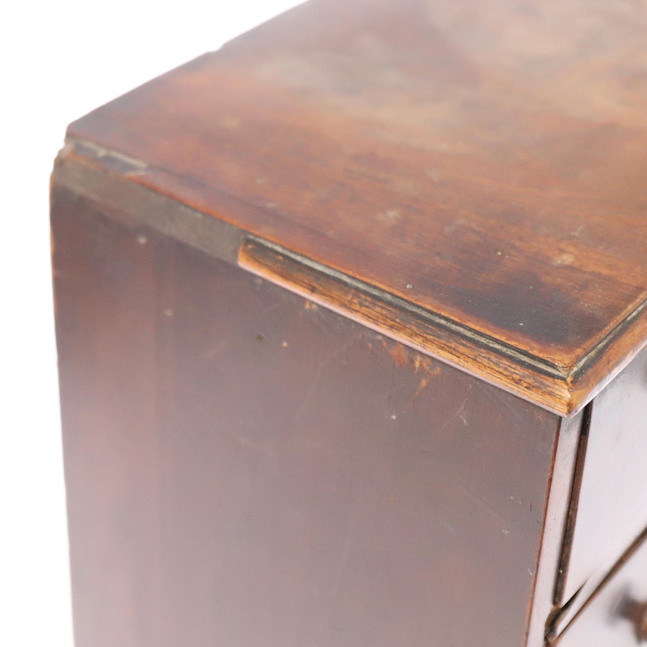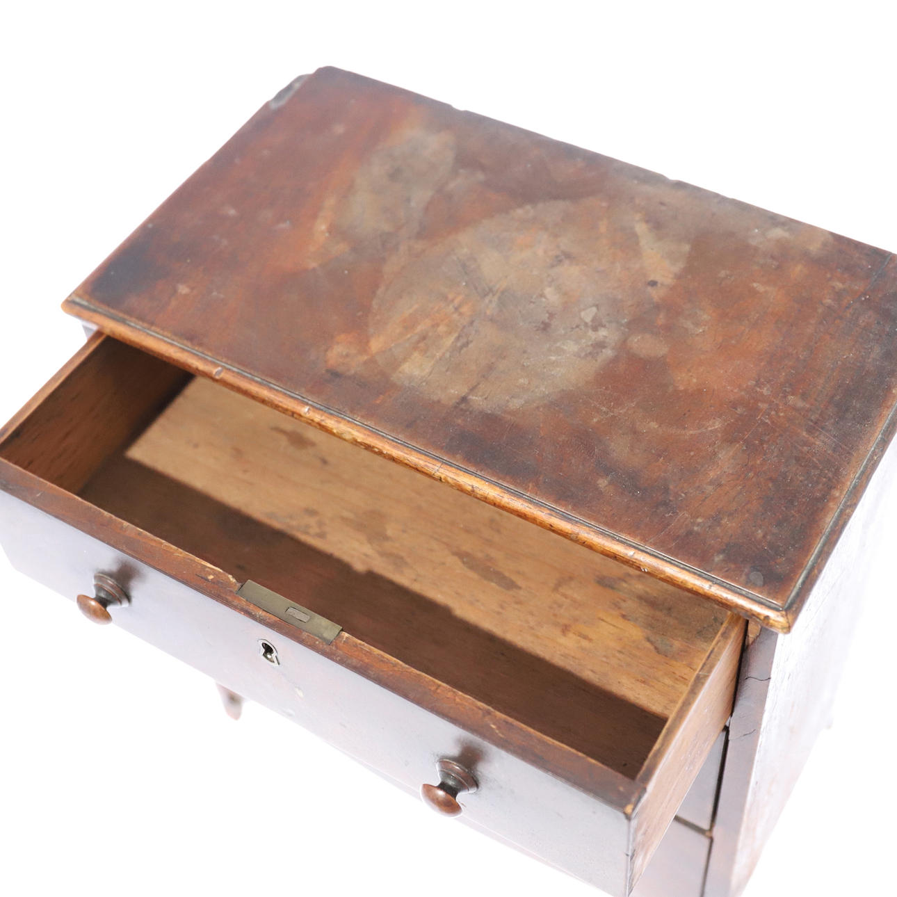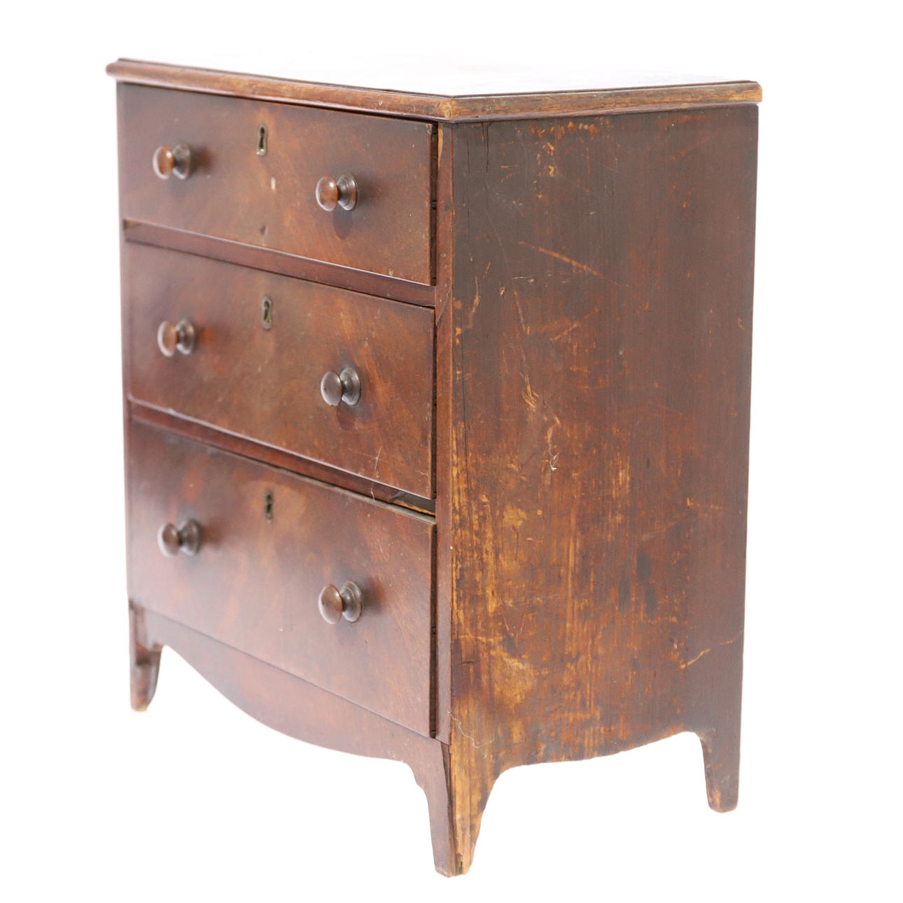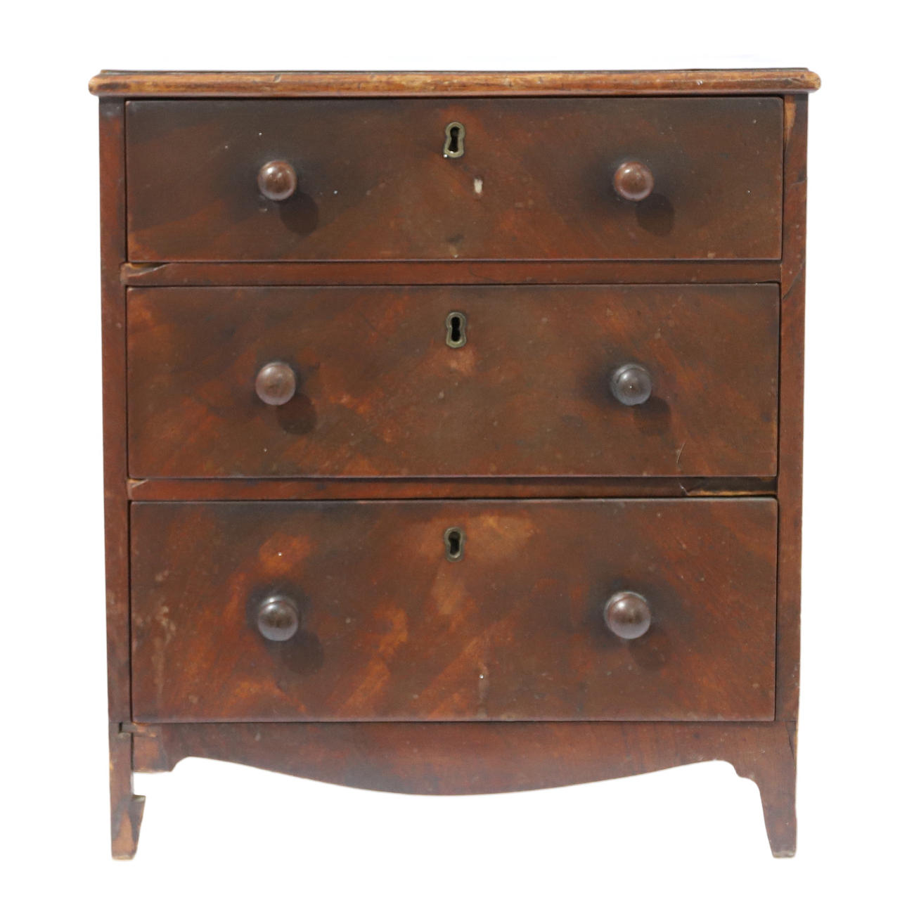 1531437. MINIATURE MØBLER, MAHOGNY KOMMODE MED TRE SKUFFER.