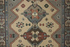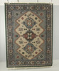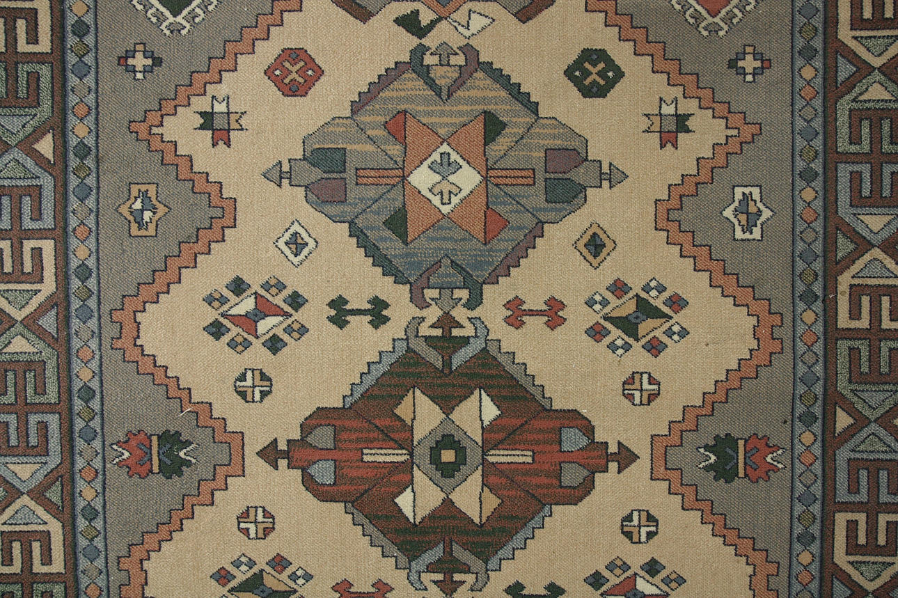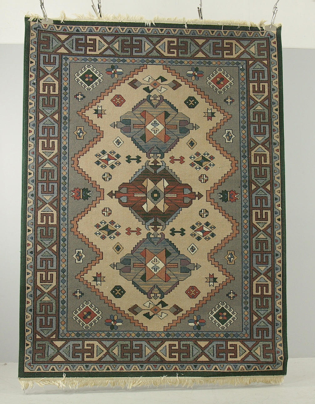 Fabriksvævet tæppe, kelim-inspireret mønster i polykrome farver.