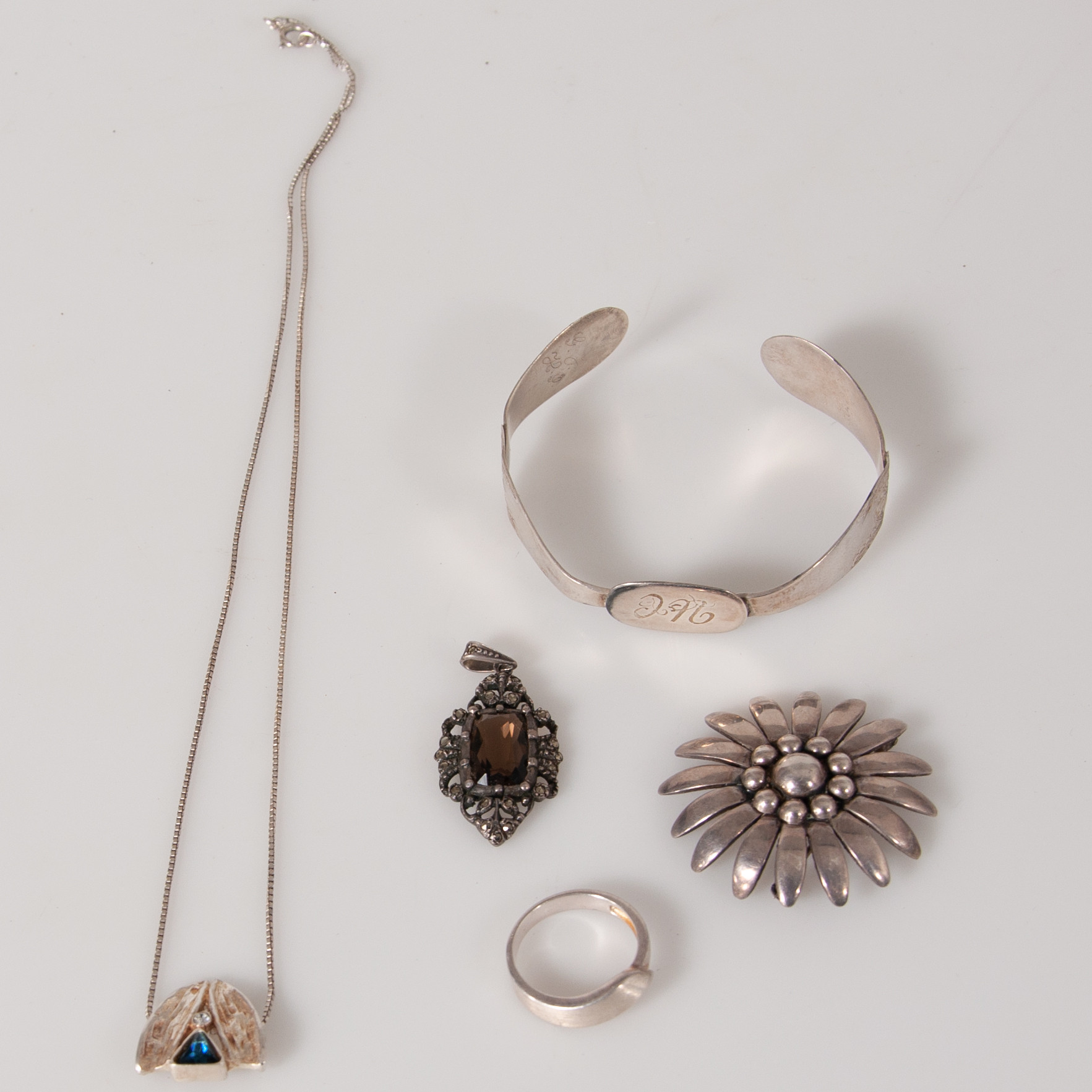 1538707. SØLV. 5 st. Armbånd, charms mm.