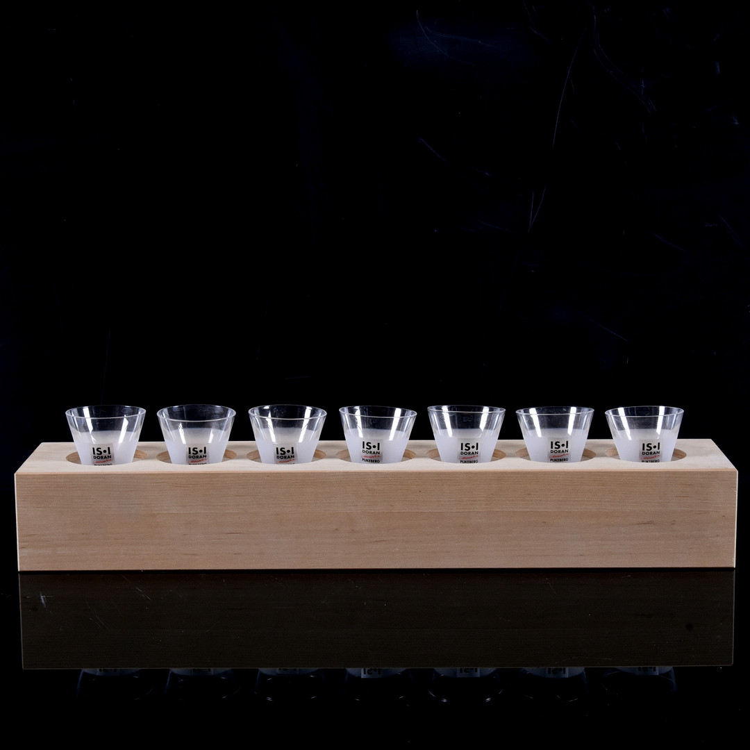 1543270. SNAPGLAS PÅ TRÆSTABEL, 7 stk, Pukeberg.