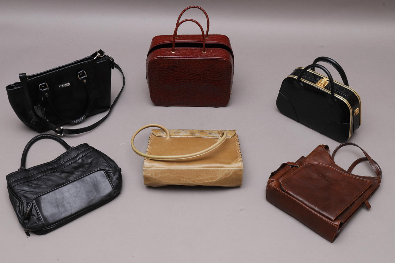 Tilbehørstaske, plastik og stof, bordeaux imiteret slangeskind, Estée Lauder. Mål ca 27x23x12 cm Håndtaske, læder, brun, Luca Ferri. Mål ca 28x25x7 cm Håndtaske, læder, lysebrun, Don Donna. Mål ca 24x23x8 cm Makeuptaske, plast og tekstil, sort slangeskindsimitation. Mål ca 28x18x8 cm Håndtaske, læder, sort. Mål ca 33x20x10 cm Hånd-/skulderstroptaske, læder, sort, The Monte. Mål ca 35x22x9 cm.