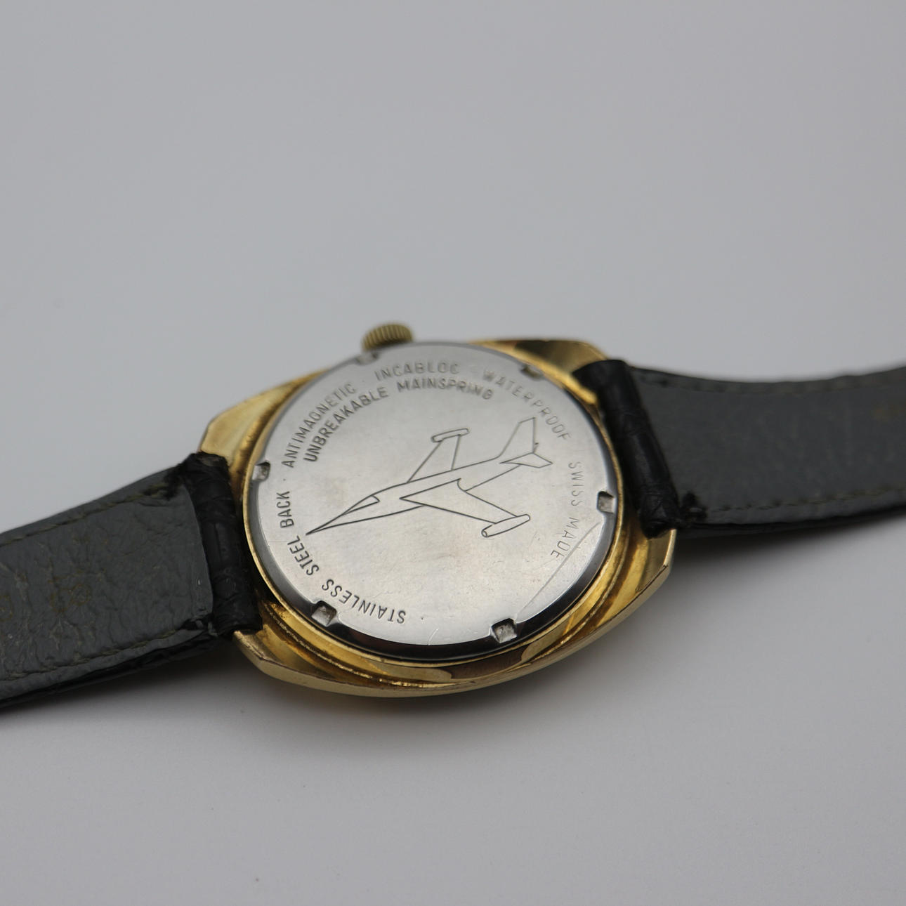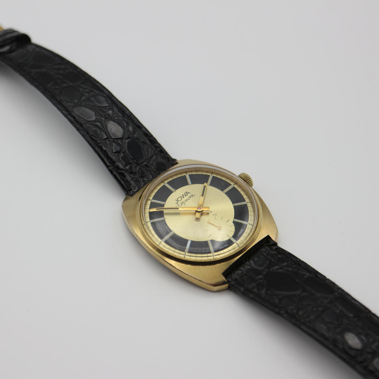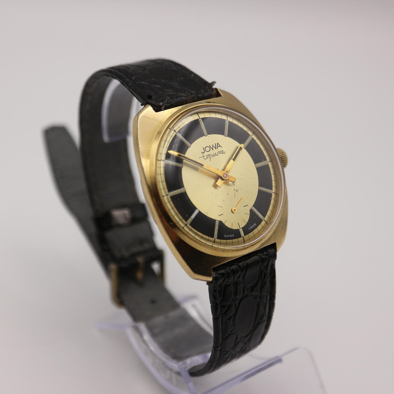 Jowa Topman pilotur, jetjager symbol på bagsiden (sjældent pilotur), schweizisk fremstillet, urkassediameter uden krone: 36 mm, antimagnetisk, incabloc 17 juveler, rustfrit stål bagside, vandtæt, 20 mikron guld dobbelt urkasse.