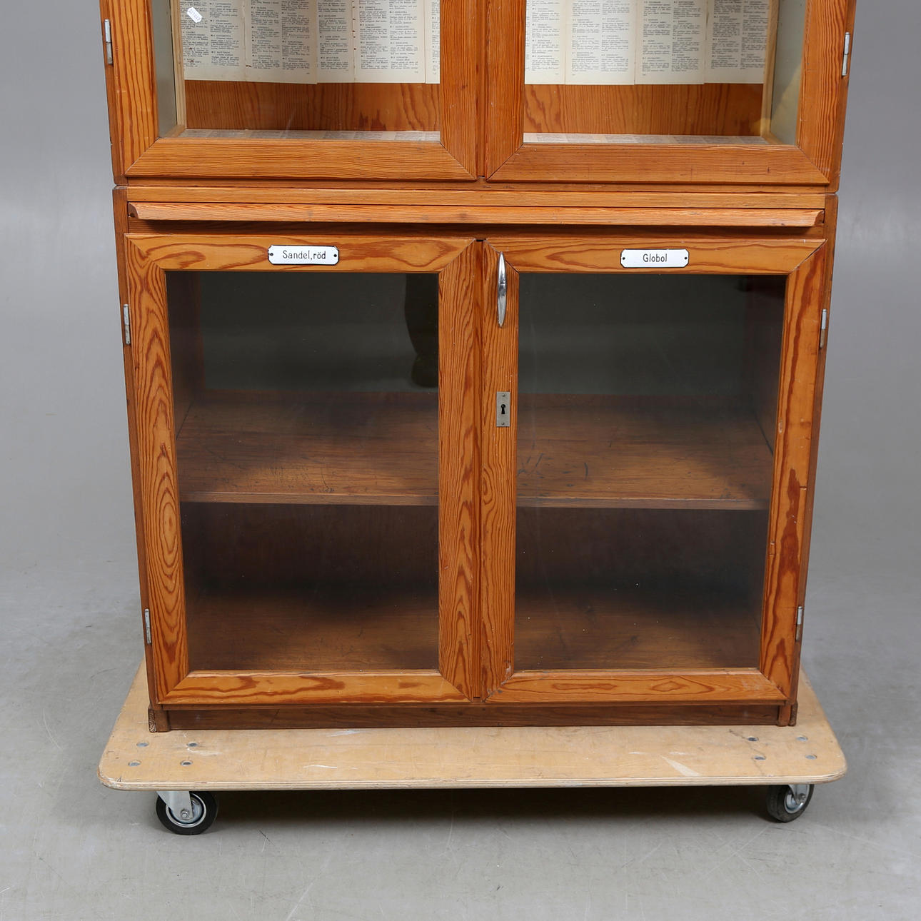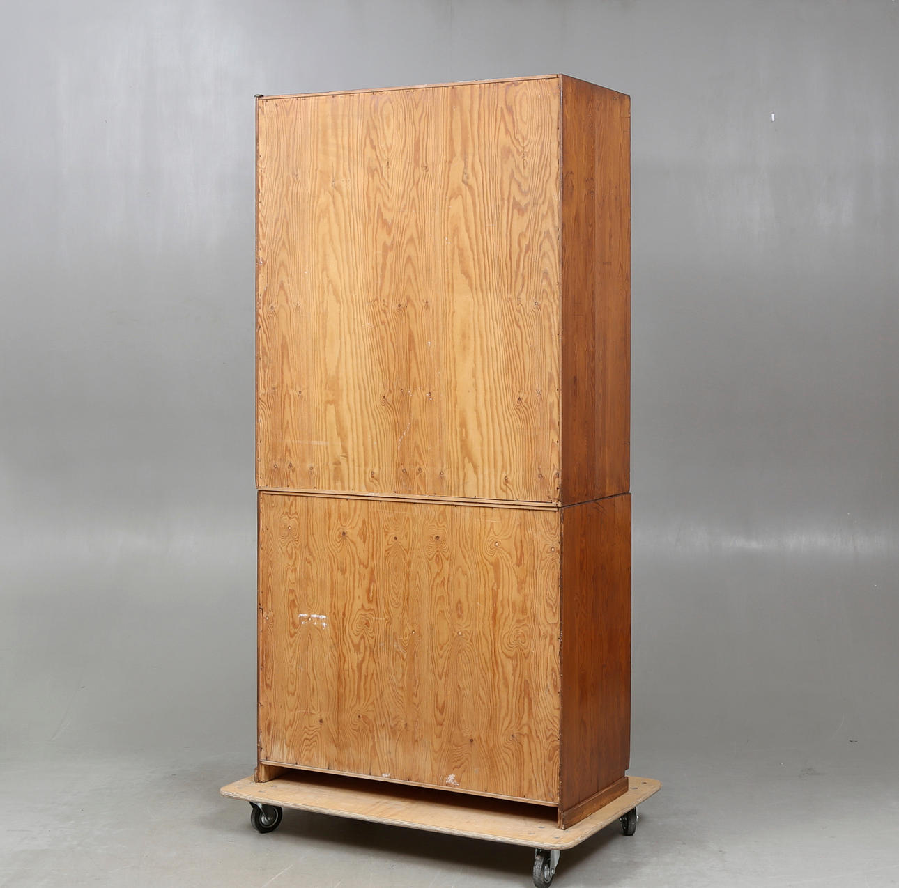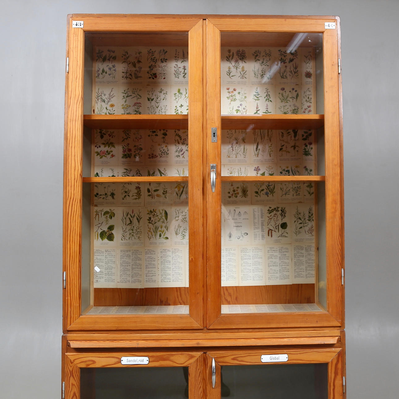 Tudelat. Fyrretræ. Overdel med et par glasdøre og underliggende hylde. Underdel med et par glasdøre med underliggende hylde. Udtrækkelig aflastningsskive. Længde 105. Bredde 46. Højde 210 cm.