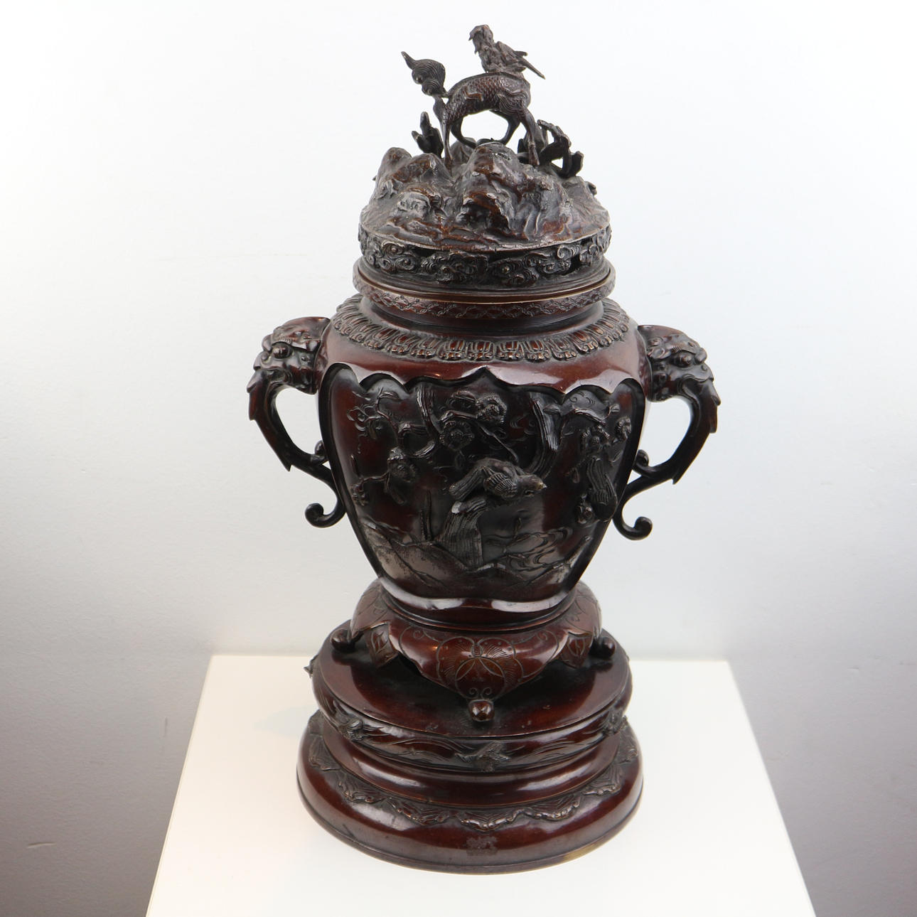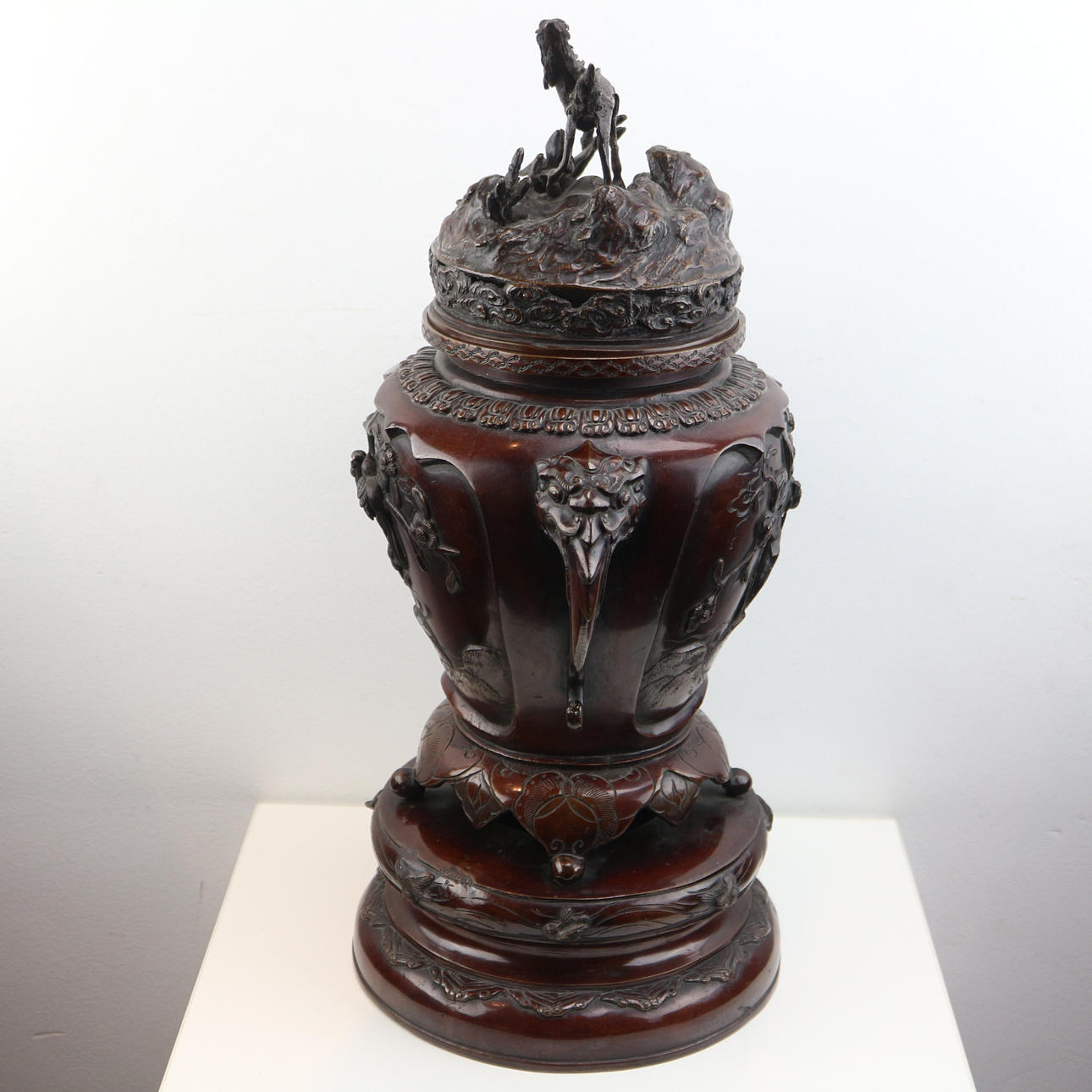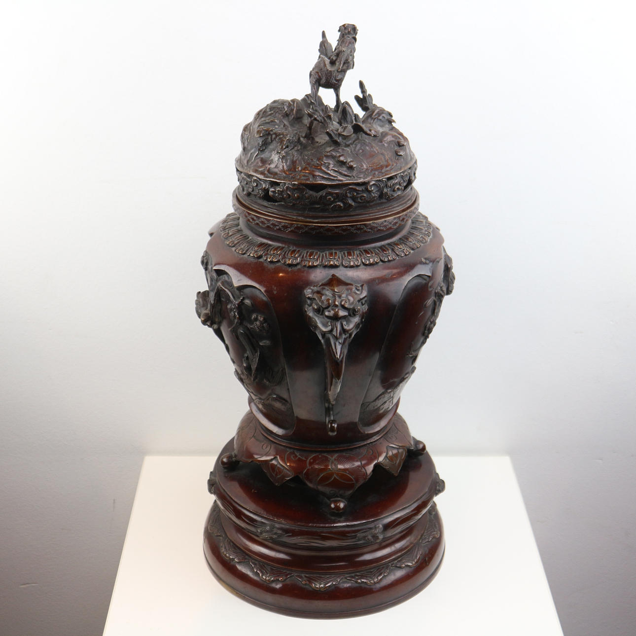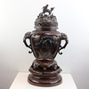 Højde med låg: ca. 52 cm bunddiameter: ca. 21cm Dette smukke og dekorative japanske røgelseskar af bronze er meget imponerende. Den er lavet af bronze og har en flot kobberrød-brun patina. Det dateres til anden halvdel af det 19. århundrede - den såkaldte Meiji-æra. Den har en drage/løve på låget. Den har også smukke blomster- og dyrerelieffer rundt om selve skålen. Samlet set er det et meget imponerende og tungt stykke lavet af solid bronze.