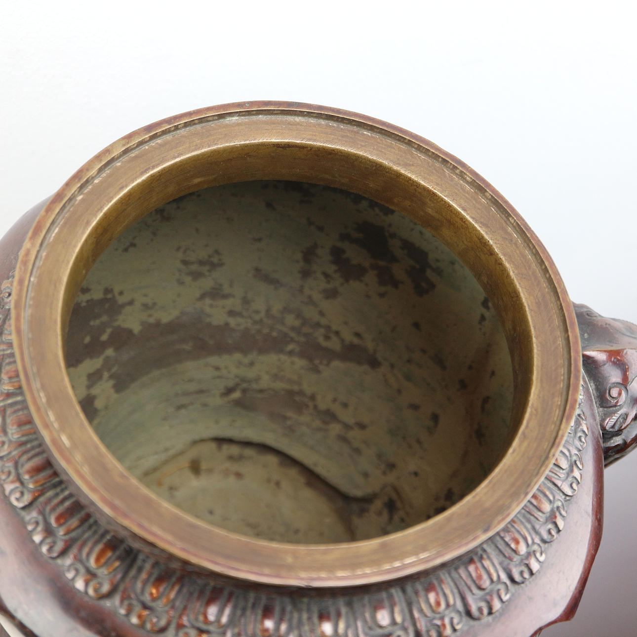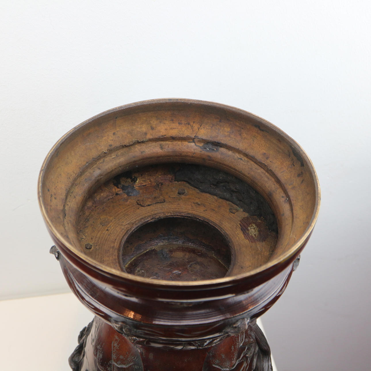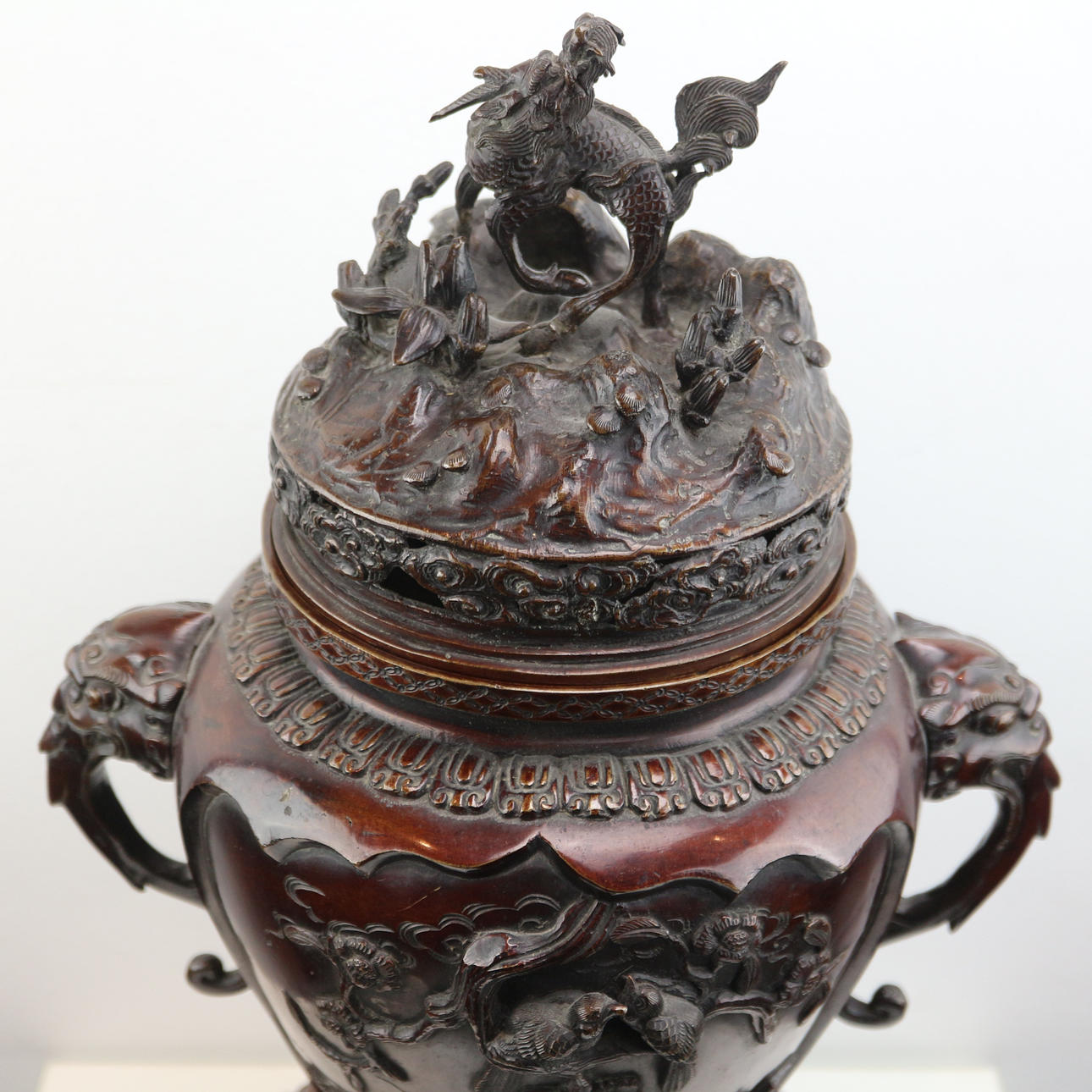Højde med låg: ca. 52 cm bunddiameter: ca. 21cm Dette smukke og dekorative japanske røgelseskar af bronze er meget imponerende. Den er lavet af bronze og har en flot kobberrød-brun patina. Det dateres til anden halvdel af det 19. århundrede - den såkaldte Meiji-æra. Den har en drage/løve på låget. Den har også smukke blomster- og dyrerelieffer rundt om selve skålen. Samlet set er det et meget imponerende og tungt stykke lavet af solid bronze.